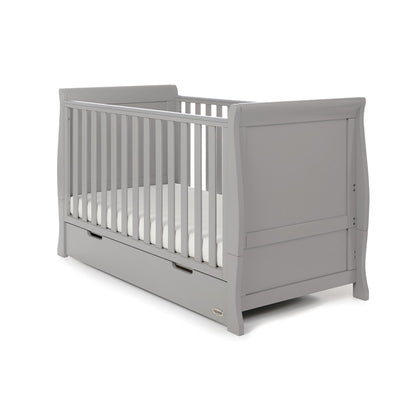 At the heart of the range is the beautiful Stamford Classic sleigh cot bed, with its elegant sleigh design offering traditional styling with a contemporary finish. Teething rails protect your child’s delicate teeth and the slatted sides ensure you can watch over your little one during their most peaceful times. The Stamford Classic offers an adjustable mattress base, the top position allowing you to put down your newborn without unnecessary bending and as your child grows, learning to sit and stand, the base can be lowered by two further positions to ensure your little one is safe and secure at all times. Once your child is old enough the Stamford Classic can be transformed into a stylish toddler bed to provide the perfect night’s sleep up until they are approximately four years old. Requires an Obaby 140 x 70cm mattress.
