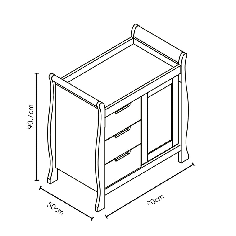 The second piece is the Stamford closed changing unit. The combination of three spacious 13L capacity drawers and full height cupboard with adjustable shelf and soft close door provide plenty of storage options for little one’s precious belongings, whilst the cleverly recessed section on the top of the changing unit perfectly accommodates a changing mat up to 76 x 46cm.