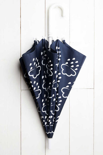 Navy kids umbrella with white rain cloud patterns, colour-revealing technology that changes design when wet, automatic open button, 85cm diameter.