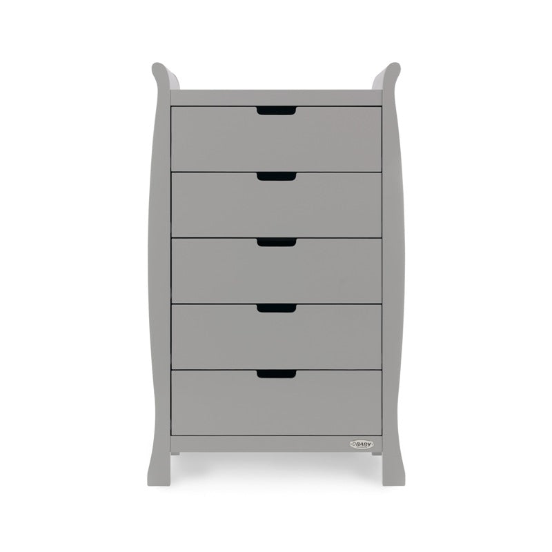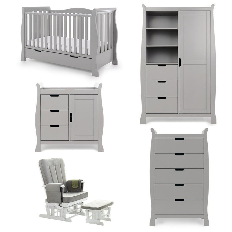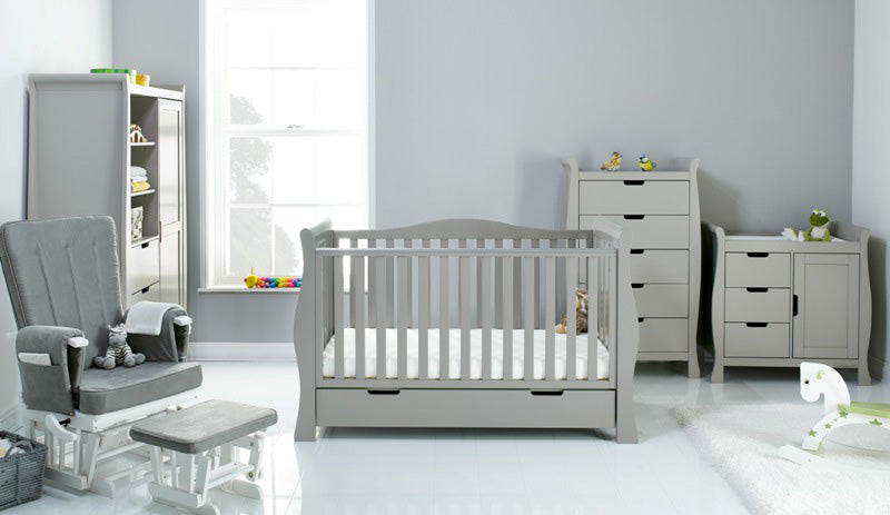 The Obaby Stamford furniture range offers families the perfect combination of style, quality and practicality. The Stamford Luxe 5 piece room set consists of the beautiful Stamford Luxe cot bed with under drawer, closed changing unit, double wardrobe, tall chest of drawers and deluxe reclining glider chair. All pieces feature the same elegant sleigh design that flows throughout the Stamford range.