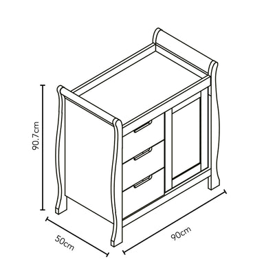 The Stamford closed changing unit’s combination of three spacious 13L capacity drawers and full height cupboard with adjustable shelf and soft close door provide plenty of storage options, whilst the cleverly recessed section on the top of the changing unit perfectly accommodates a changing mat up to 76 x 46cm.