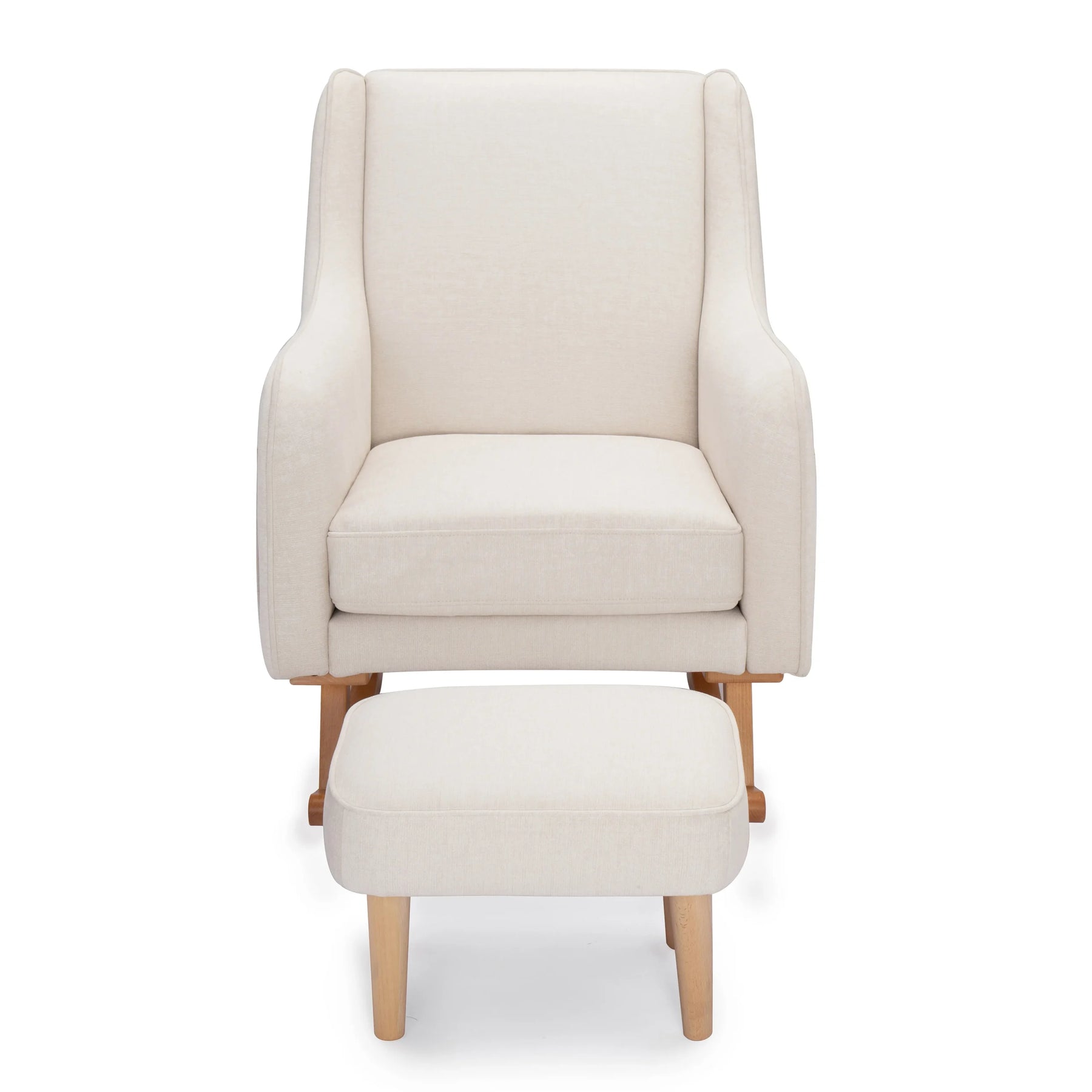 it back and relax with your precious little one in the Babymore Ida Nursing Chair. The smooth and gentle rocking motion, along with a deep seat, supportive back rest and curved arm rests, ensure maximum comfort and provide the perfect place for nurturing, feeding and bonding. Two handy storage pockets for all your baby’s essentials mean you don’t have to get up and disturb baby whilst they settle. Matching footstool included for added comfort for those tired legs. Available in three soft neutral colours – Ivory, Cashmere and Bouclé – perfectly complementing not only your nursery but any room setting for years to come.
