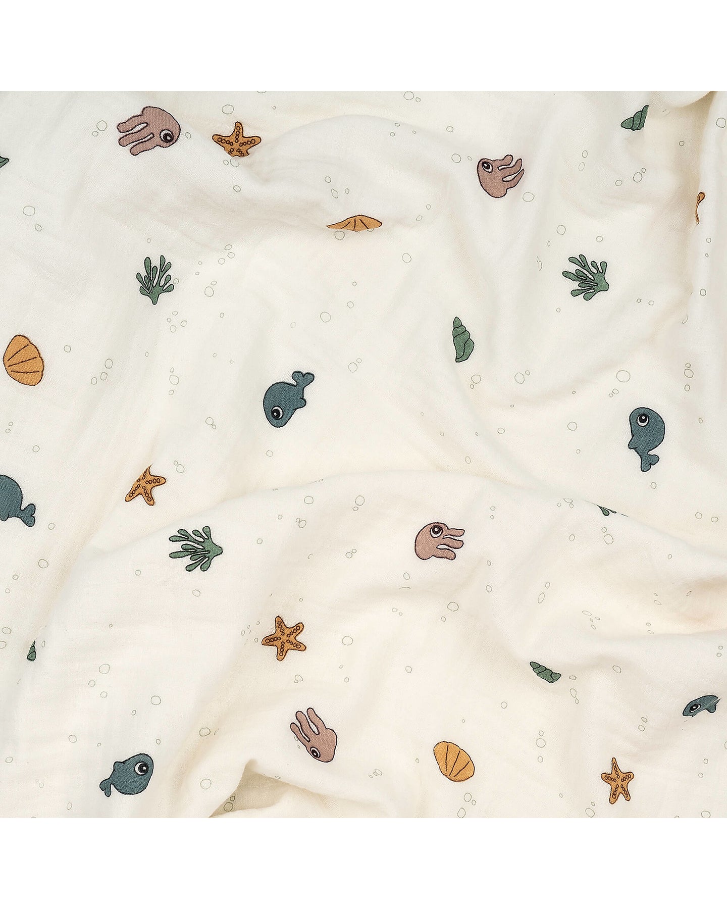 The beige muslin blanket is decorated with Wally the whale together with cute ocean elements; shells, coral reef and sea stars in tones of blue and mustard.