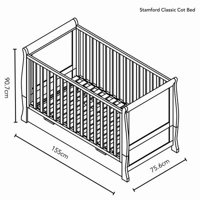 At the heart of the range is the beautiful Stamford Classic sleigh cot bed. Teething rails protect your child’s delicate teeth and the slatted sides ensure you can watch over your little one during their most peaceful times. The Stamford Classic offers an adjustable mattress base that can be lowered as your child grows to ensure your little one is safe and secure at all times. Once your child is old enough, the Stamford Classic can be transformed into a stylish toddler bed to provide the perfect night’s sleep up until they are approximately four years old. Requires an Obaby 140 x 70cm mattress. Also includes a generous 70L capacity underdrawer for extra storage space.
