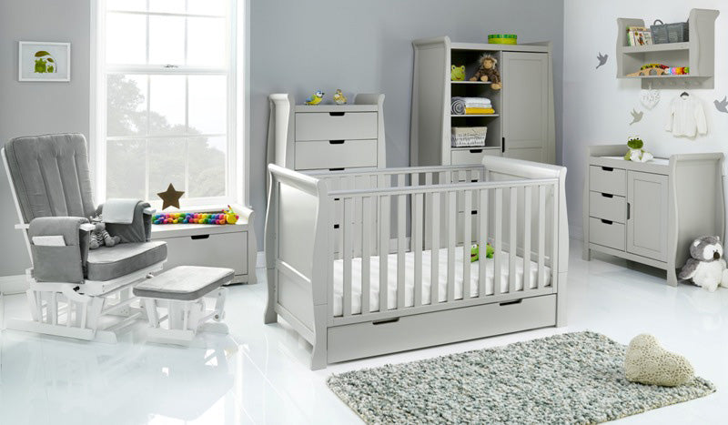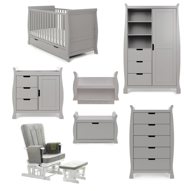 The Obaby Stamford furniture range offers families the perfect combination of style, quality and practicality. The Stamford Classic 7 piece room set consists of the beautiful Stamford Classic cot bed with under drawer, closed changing unit, double wardrobe, tall chest of drawers, toy box, shelf and deluxe reclining glider chair. All pieces feature the same elegant sleigh design that flows throughout the Stamford range.