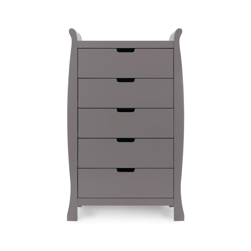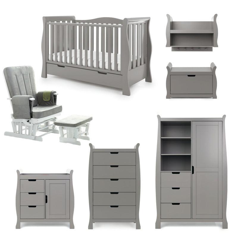 The Obaby Stamford furniture range offers families the perfect combination of style, quality and practicality. The Stamford Luxe 7 piece room set consists of the beautiful Stamford Luxe cot bed with under drawer, closed changing unit, double wardrobe, tall chest of drawers, toy box, shelf and deluxe reclining glider chair. All pieces feature the same elegant sleigh design that flows through the Stamford range.