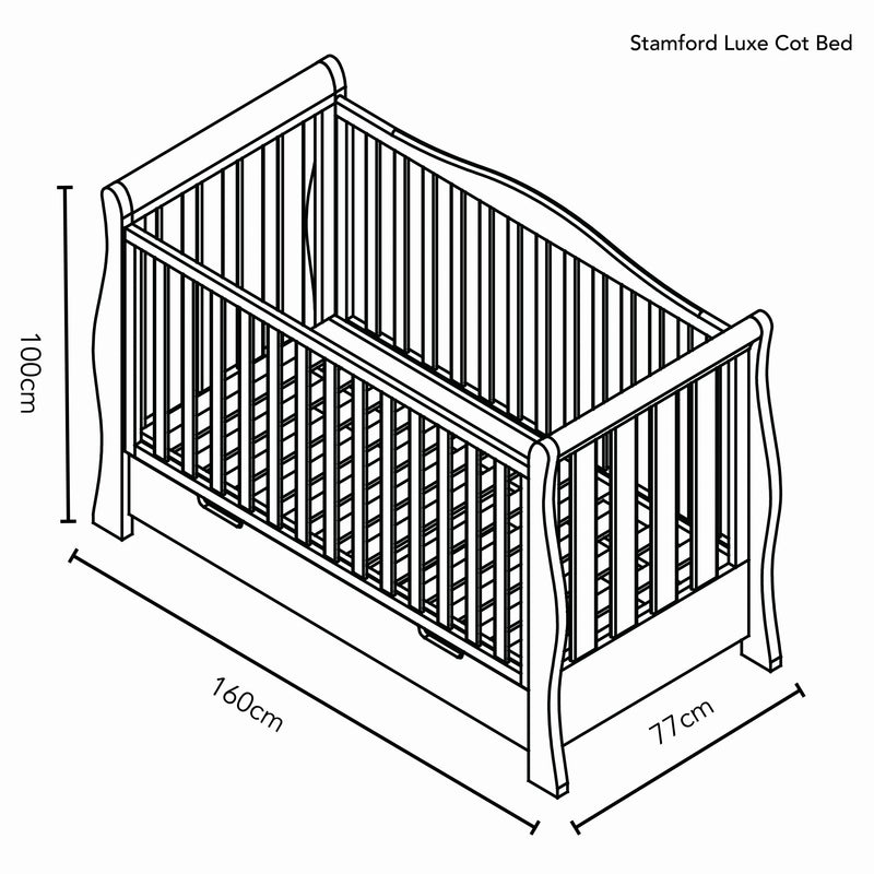 Standing proud at the top of the range is the beautiful Stamford Luxe sleigh cot bed. The Luxe cot bed can adapt to suit every stage of your little one’s early development. Starting as a cot, the Luxe features an adjustable mattress base that can be lowered as your baby learns to sit and stand, so that they are safe and secure at all times while the presence of a teething rail helps to protect their delicate first teeth. Once your child is old enough to progress, the Luxe can be transformed into a toddler bed, with or without safety rail, that is suitable to approximately four years old. And finally, when they outgrow this, the Luxe can become a useful day bed for lounging and relaxing. Requires an Obaby 140 x 70cm mattress. The integrated under drawer has a huge 77L capacity, smoothly glides on runners and fits neatly under the cot bed.