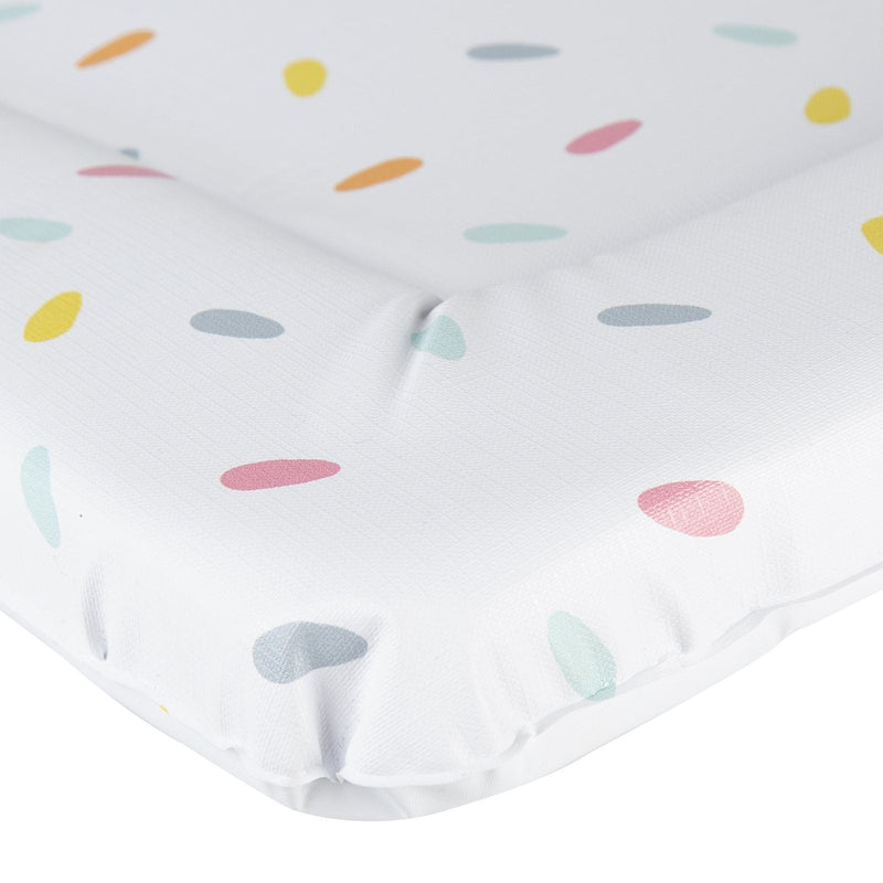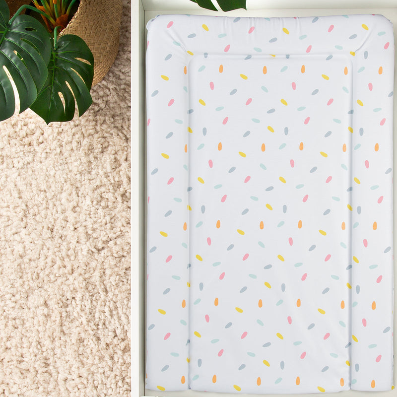 The CuddleCo PVC changing mat is waterproof, wipe clean and soft padded,  providing a comfortable area to change your baby. Made of Phthalate-free PVC material, which is safe for baby's skin. The adorable multi-coloured confetti print makes the changing mat a beautiful addition to your nursery furniture. The mat fits standard sized changing units, including all our baby changers such as our Clara dresser.