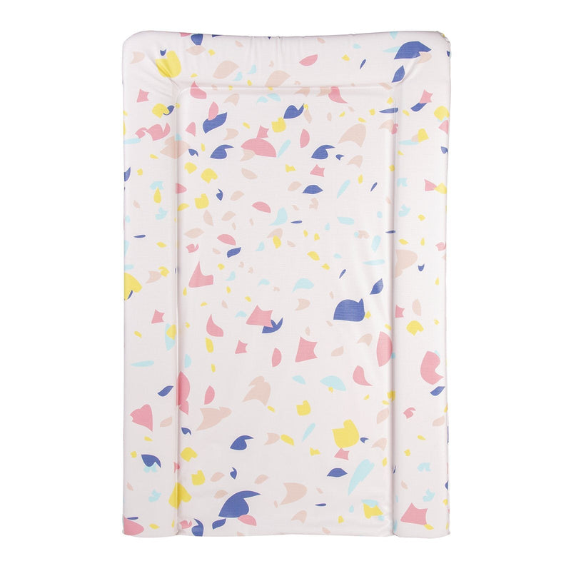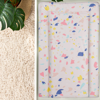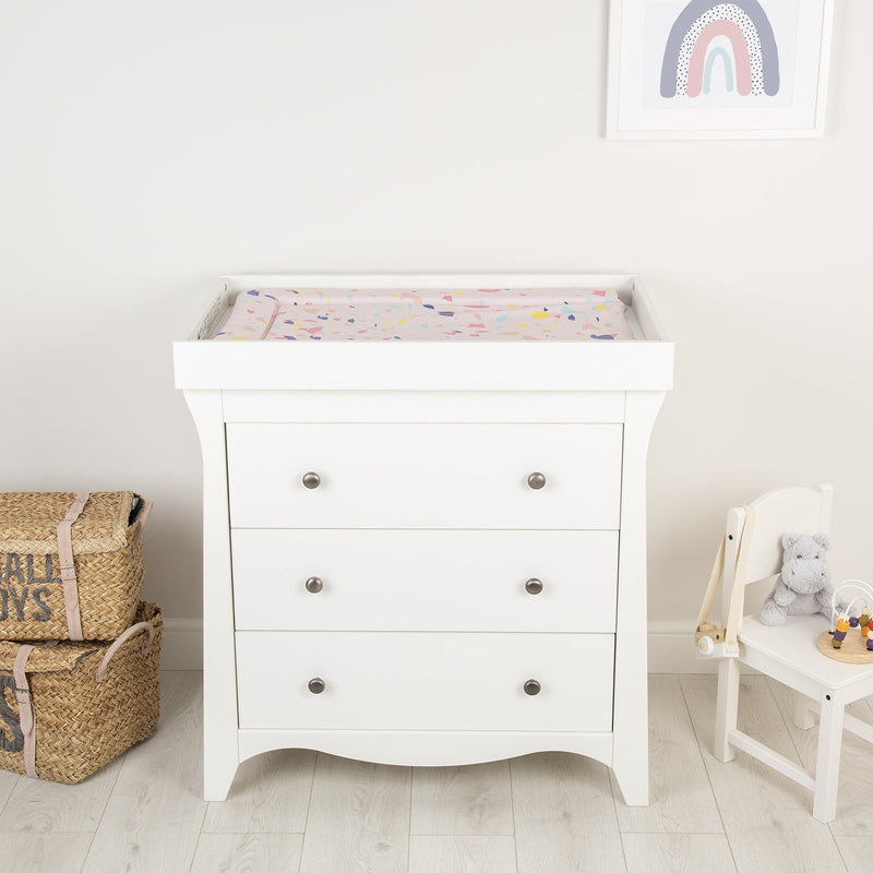 The CuddleCo PVC changing mat is waterproof, wipe clean and soft padded,  providing a comfortable area to change your baby. Made of Phthalate-free PVC material, which is safe for baby's skin. The adorable terrazzo pink print makes the changing mat a beautiful addition to your nursery furniture. The mat fits standard sized changing units, including all our baby changers such as our Clara dresser.
