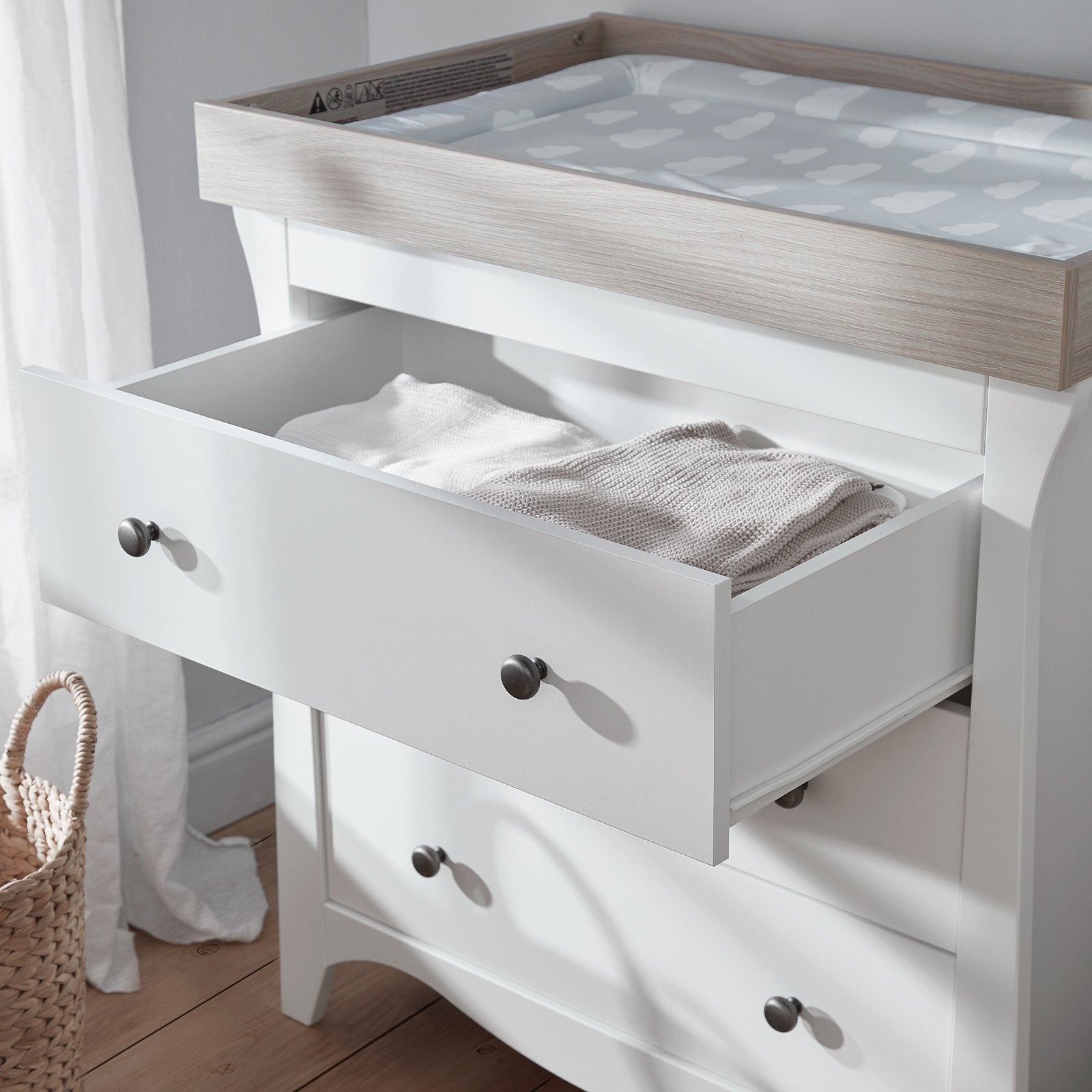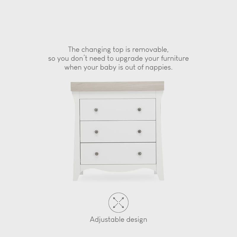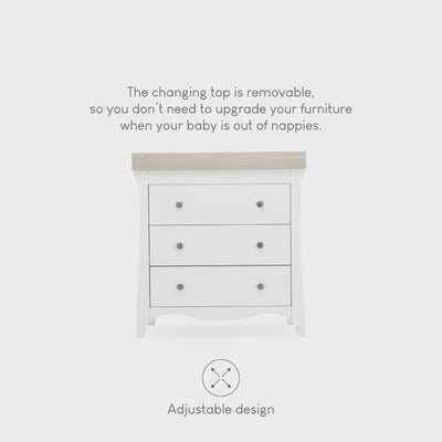 The Clara nursery dresser has 3 deep drawers, ideal for keeping all your little one’s essentials neat, from nappies and creams to clean sleepsuits and baby blankets, Clara has plenty of storage space. Featuring a removable changing top, you can easily convert Clara into a standalone dresser once your baby is out of nappies. No need for furniture upgrades.