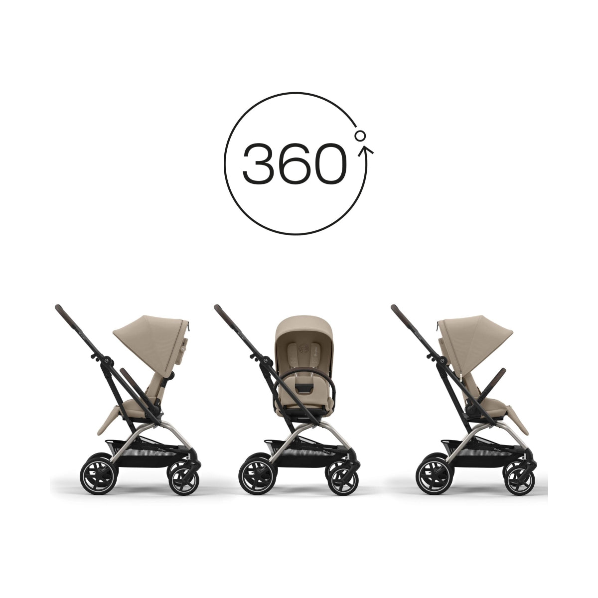 - 360˚ Rotatable Seat feature allows the seat of the pushchair to rotate fully, offering flexibility in terms of positioning the child facing the parent or facing outward