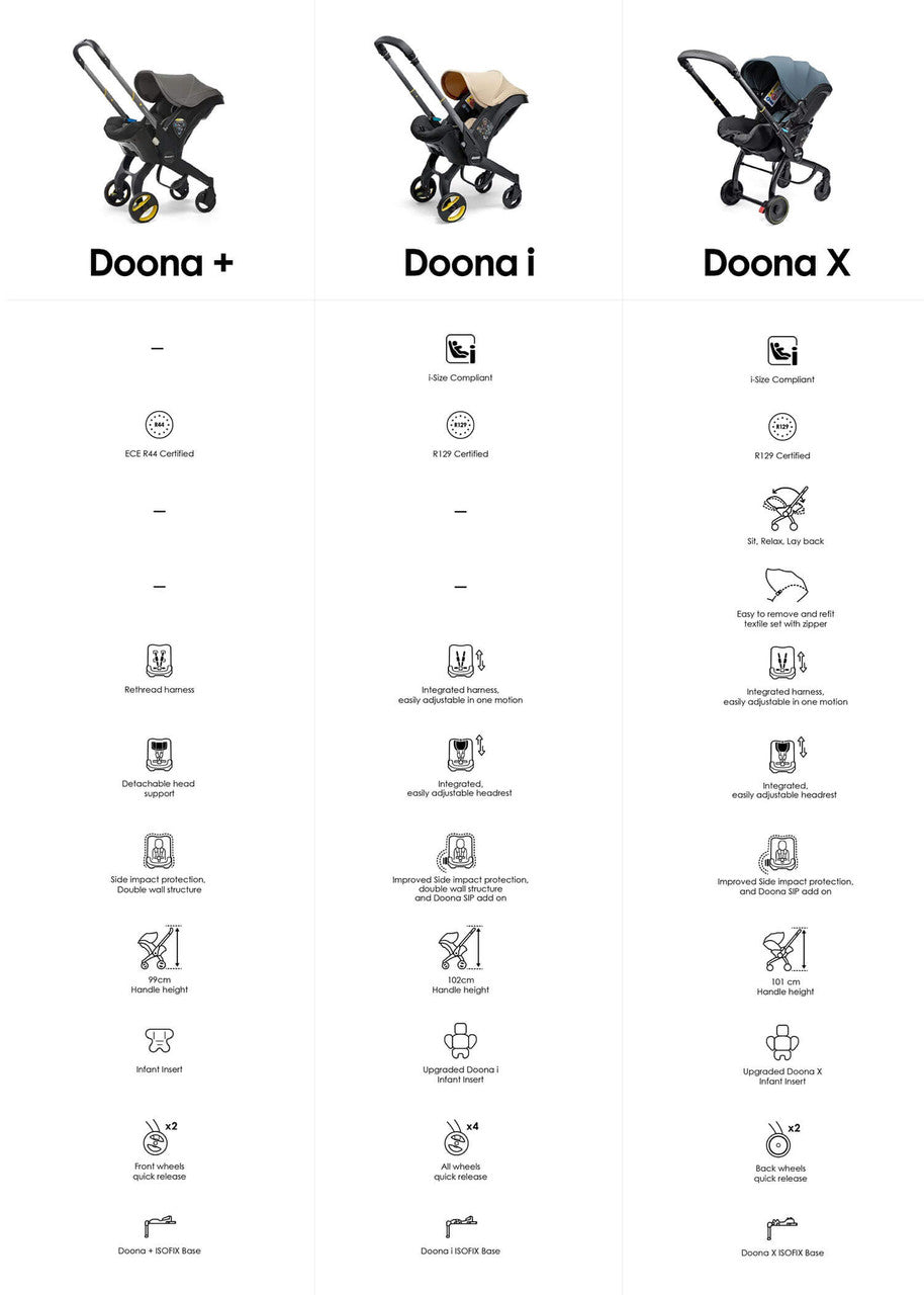 In comparison to previous version, the Doona i features longer handlebar, which makes it for more convenient to use with taller parents. In the car seat mode the folded handlebar doubles as a Anti-Rebound bar when the seat is installed without the base. The TUV certification for air travel, making it an excellent solution for plane trips with babies**.