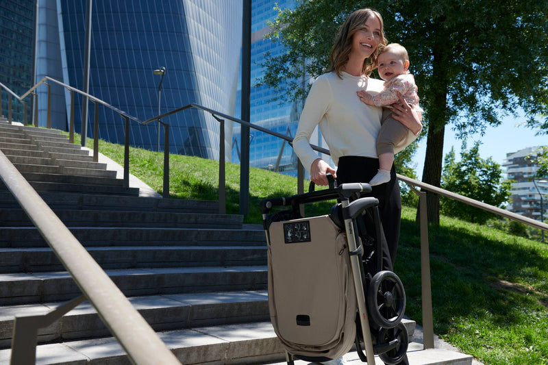 Inglesina Electa Duo Stroller folded compactly beside a woman carrying a baby outdoors near urban stairs in Tribeca Green color