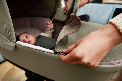 Inglesina Electa Duo Stroller carrycot in Tribeca Green with baby inside and hand adjusting cover.