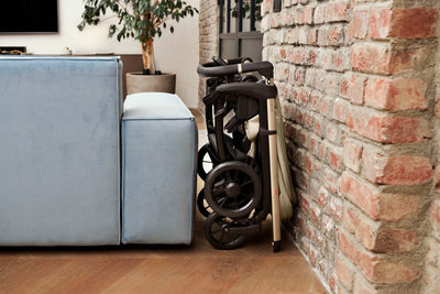 Folded Inglesina Electa Duo Stroller in Tribeca Green color stored next to a blue sofa and brick wall indoors.