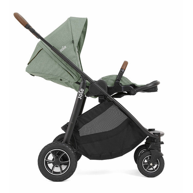 Joie Versatrax stroller with Ramble XL carrycot in laurel green, adjustable leatherette handle, all-wheel suspension, and large storage basket
