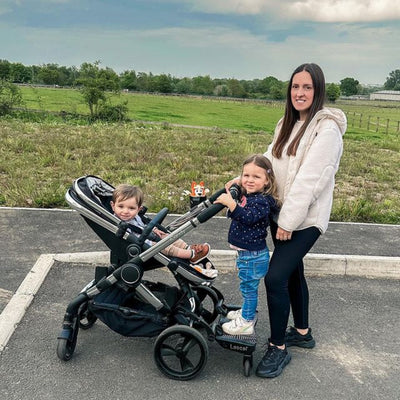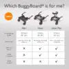 The compact BuggyBoard Mini has a smaller platform and is great for use with umbrella strollers. Alternatively, the premium BuggyBoard Maxi has an extra-large platform with higher ground clearance and an even more comfortable suspension system – great for all terrains and surfaces.