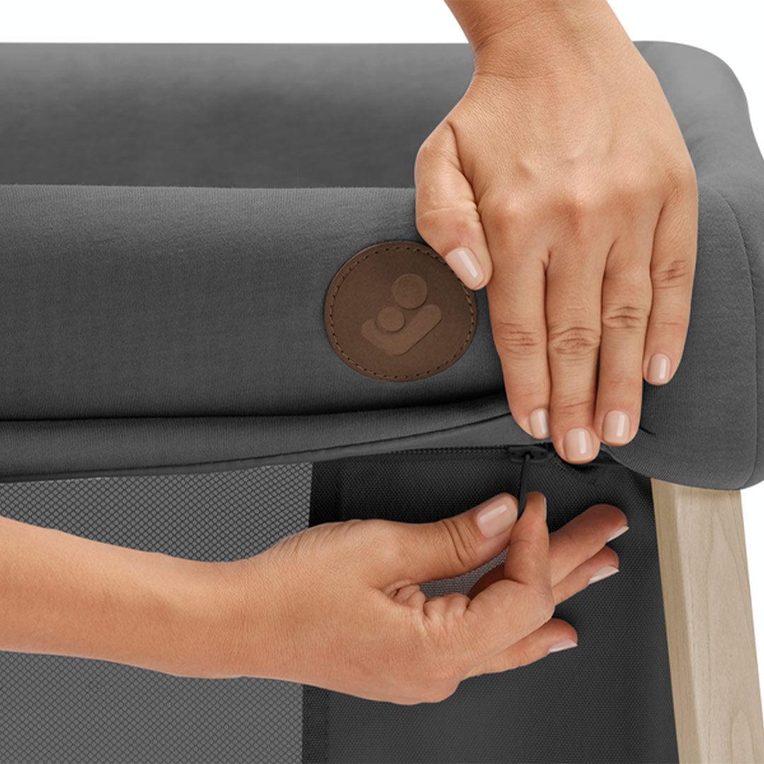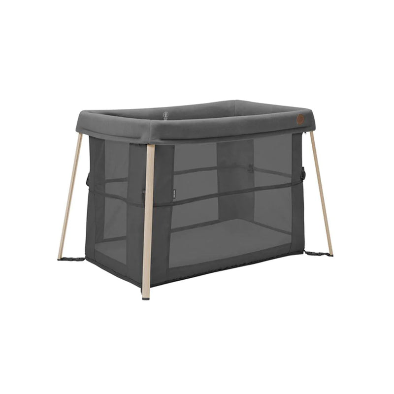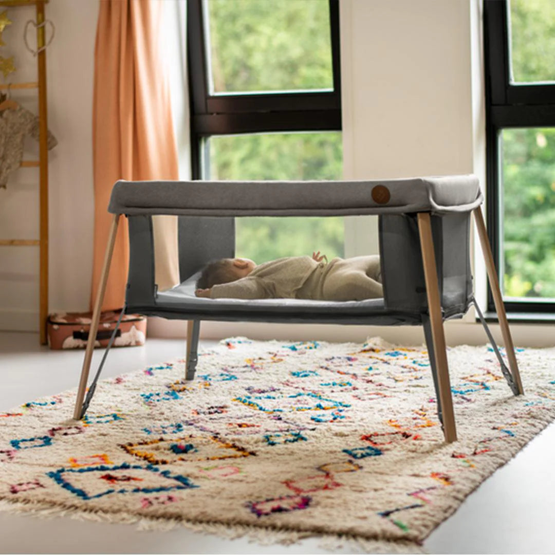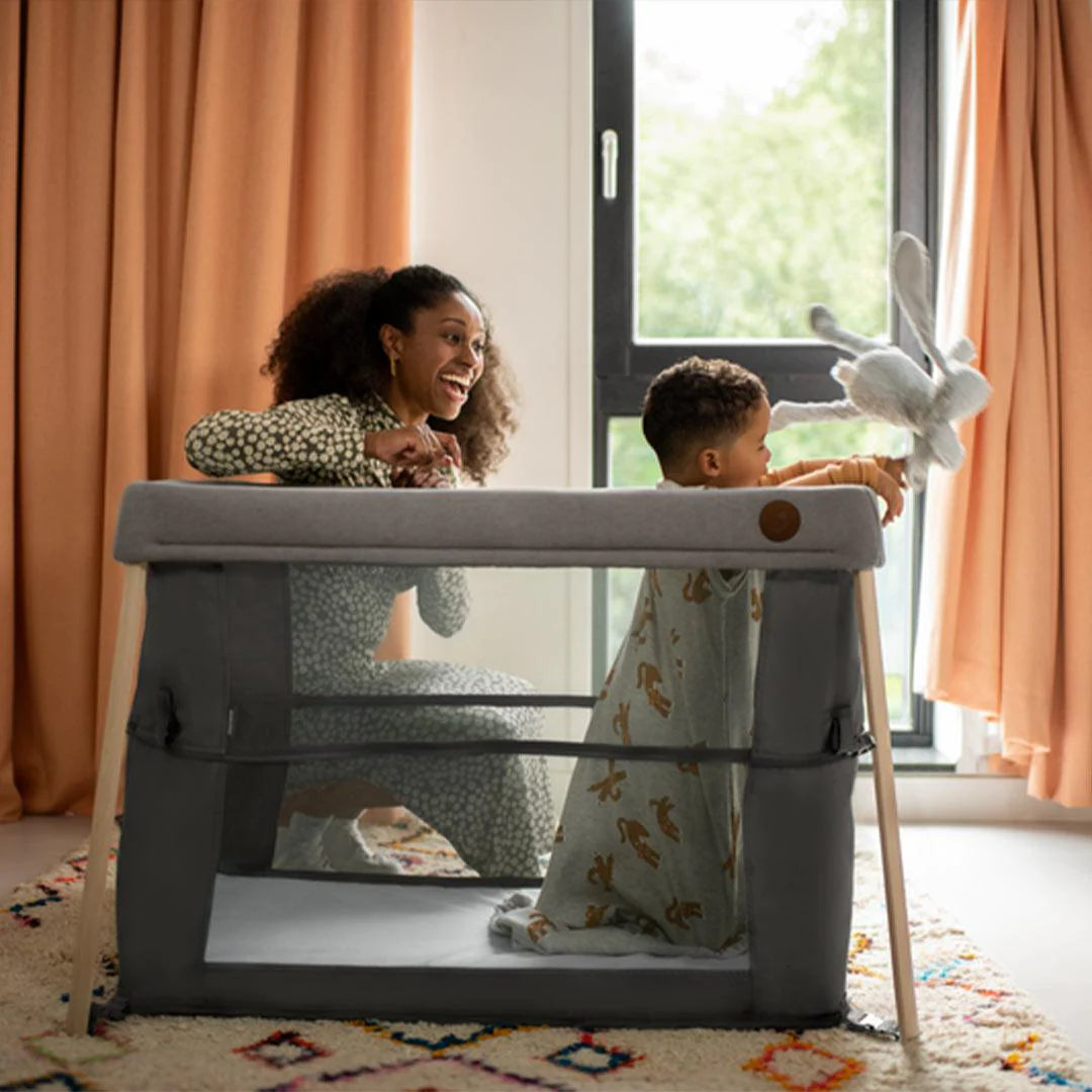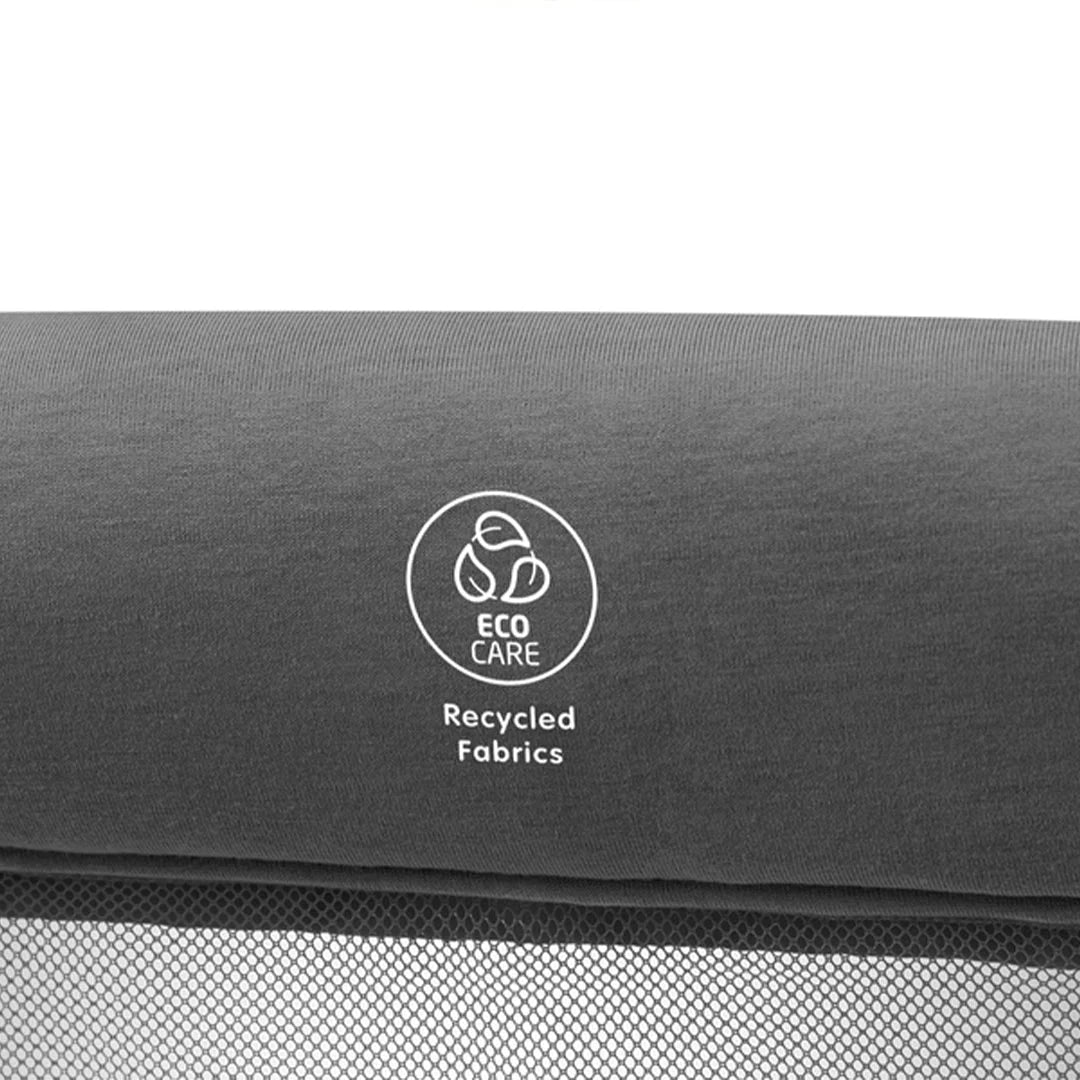 The Maxi-Cosi Iris Beyond Eco Travel Cot in Beyond Graphite has two sleeping levels, so you can raise the extra-comfortable mattress to put your newborn down for a nap or lower it to ensure your toddler has a comfy place to sleep. Made from Eco Care, 100% recycled fabrics.