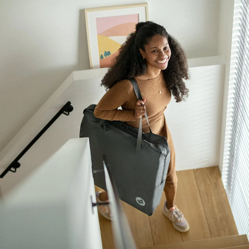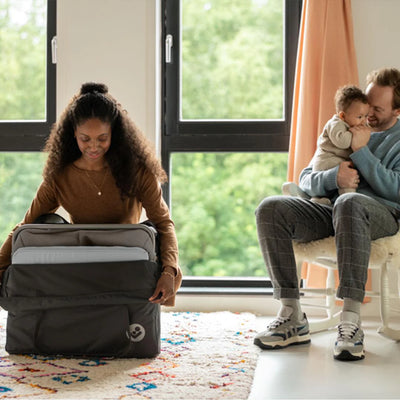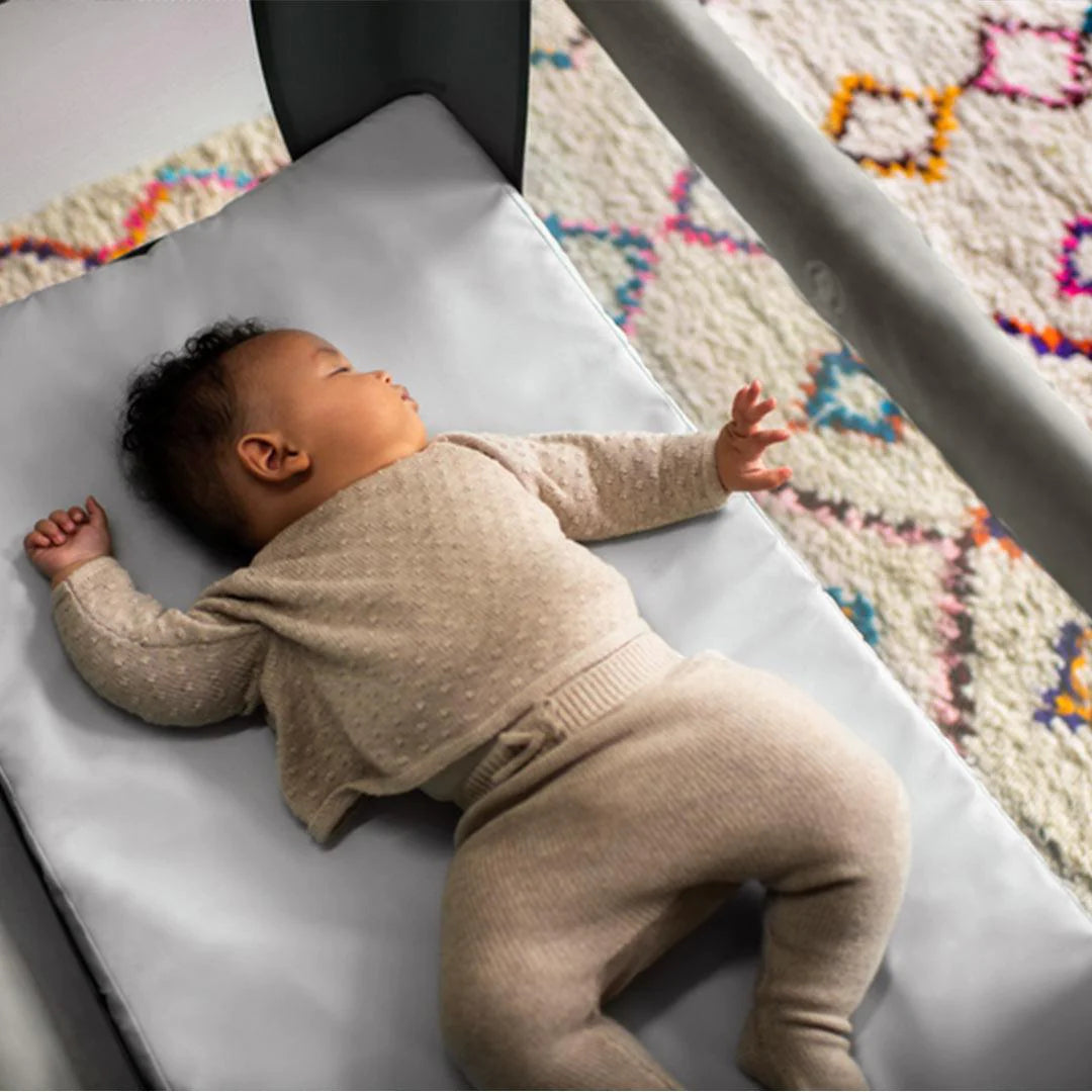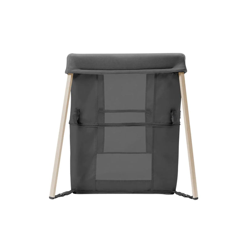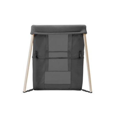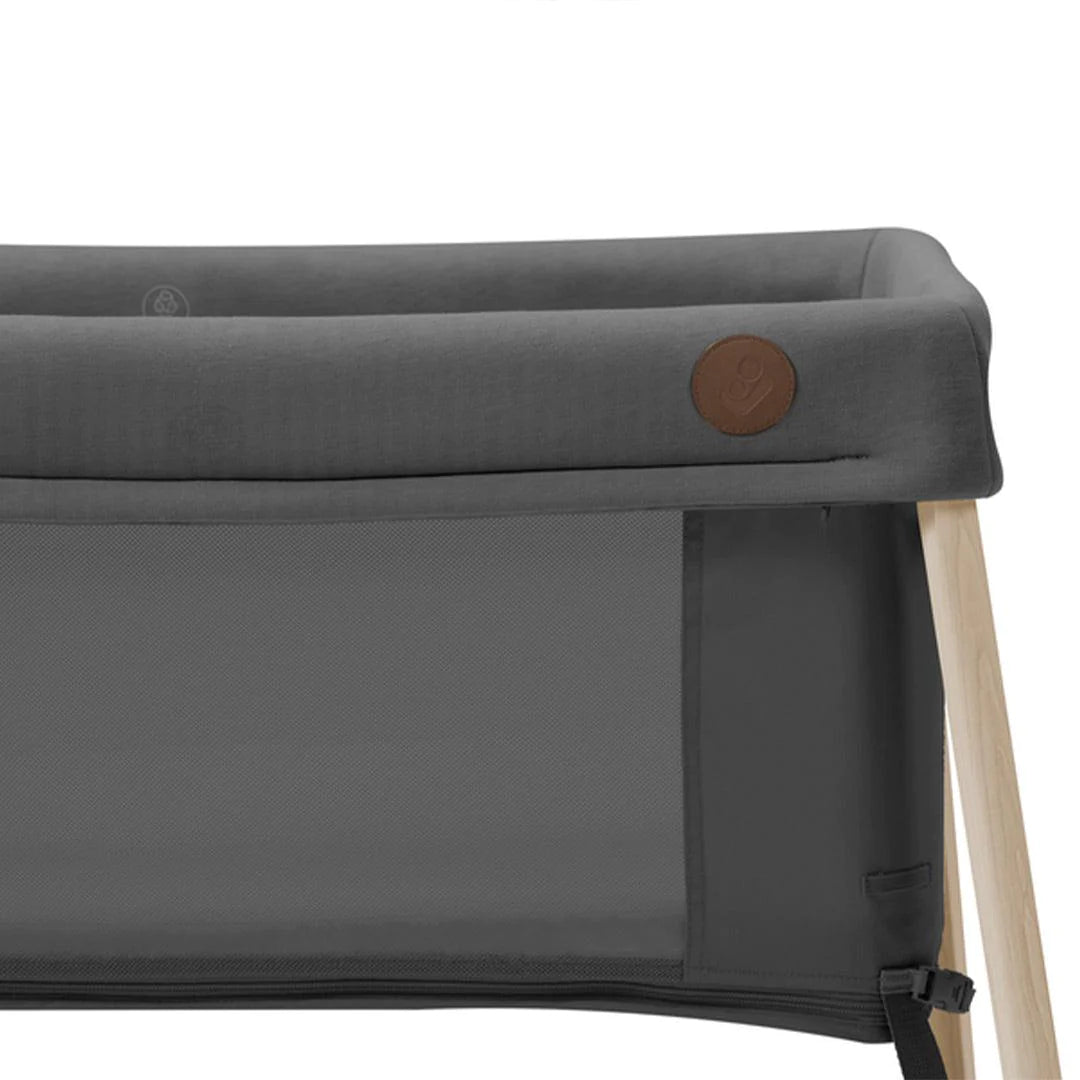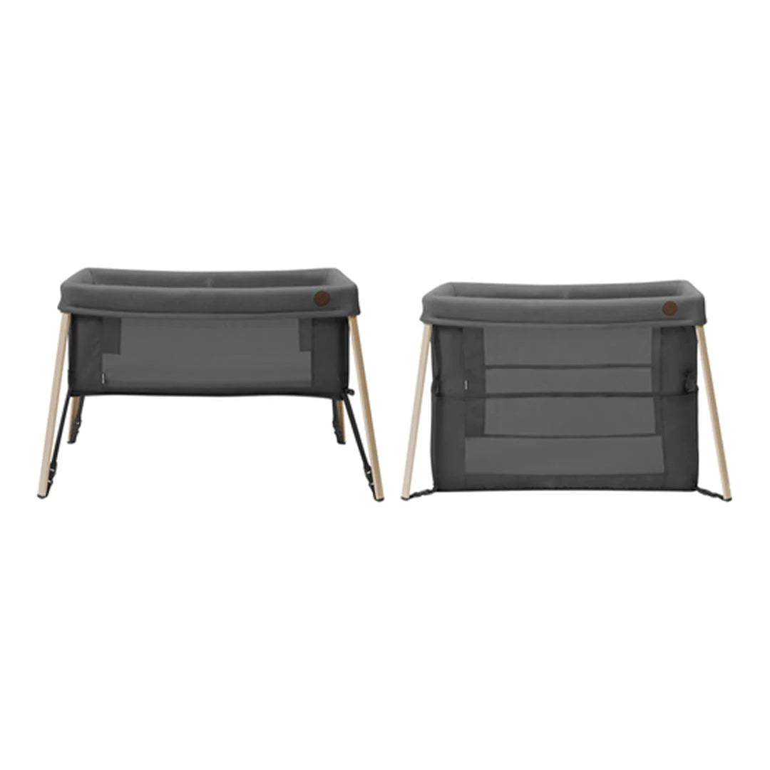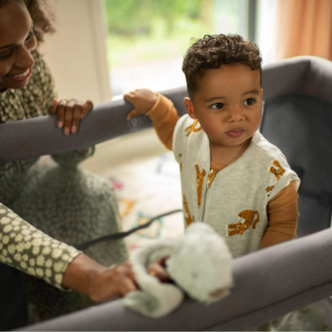 The Maxi-Cosi Iris Beyond Eco Travel Cot in Beyond Graphite has two sleeping levels, so you can raise the extra-comfortable mattress to put your newborn down for a nap or lower it to ensure your toddler has a comfy place to sleep. Made from Eco Care, 100% recycled fabrics.