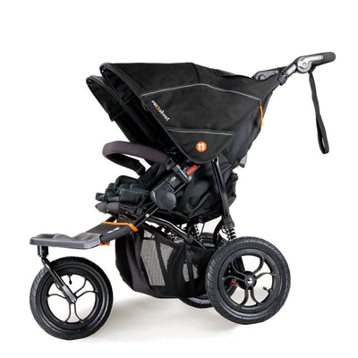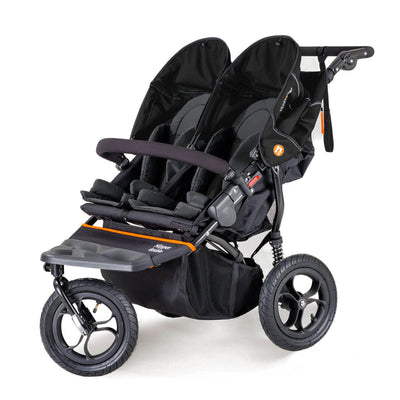 As well as the single version, the Out n About Nipper Double V5 can be recognised by improved technical water resistant and easy to clean fabrics available in multiple stylish colours, finished with new company logos and energetic orange accents. Its has been equipped of two multi-position, flat-reclining seats with liners, 5-point safety harnesses and full width bumper bar for sharing. The buggy features reliable one-hand folding mechanism with auto-lock, which effectively collapses this double stroller to a relatively compact, easy to handle and transport size.