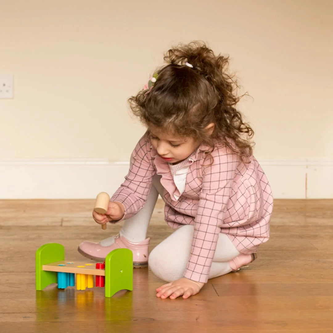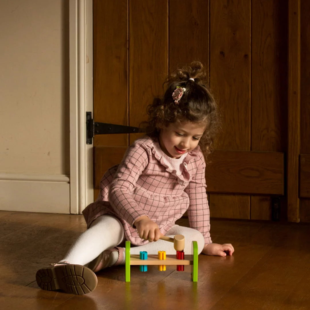 Colourful wooden pounding bench with 6 pegs and a hammer that will help your little one develop their hand-eye coordination and arm strength.