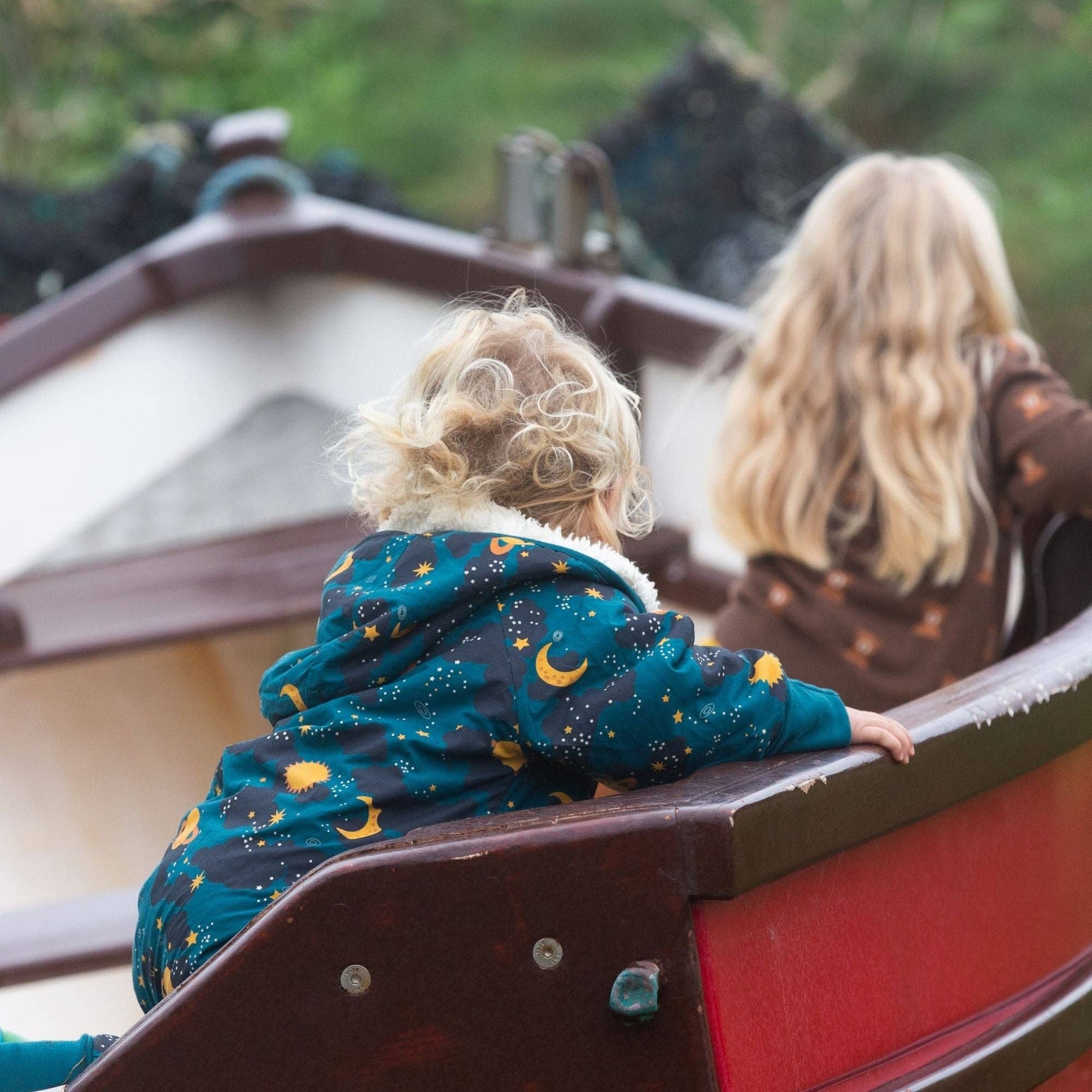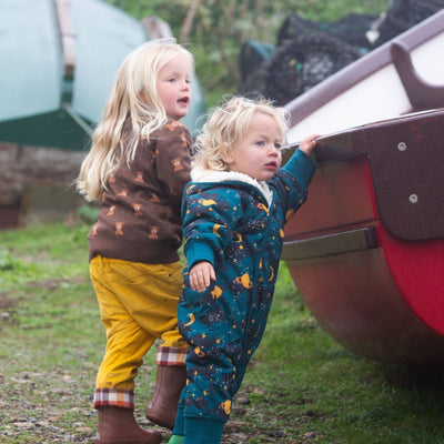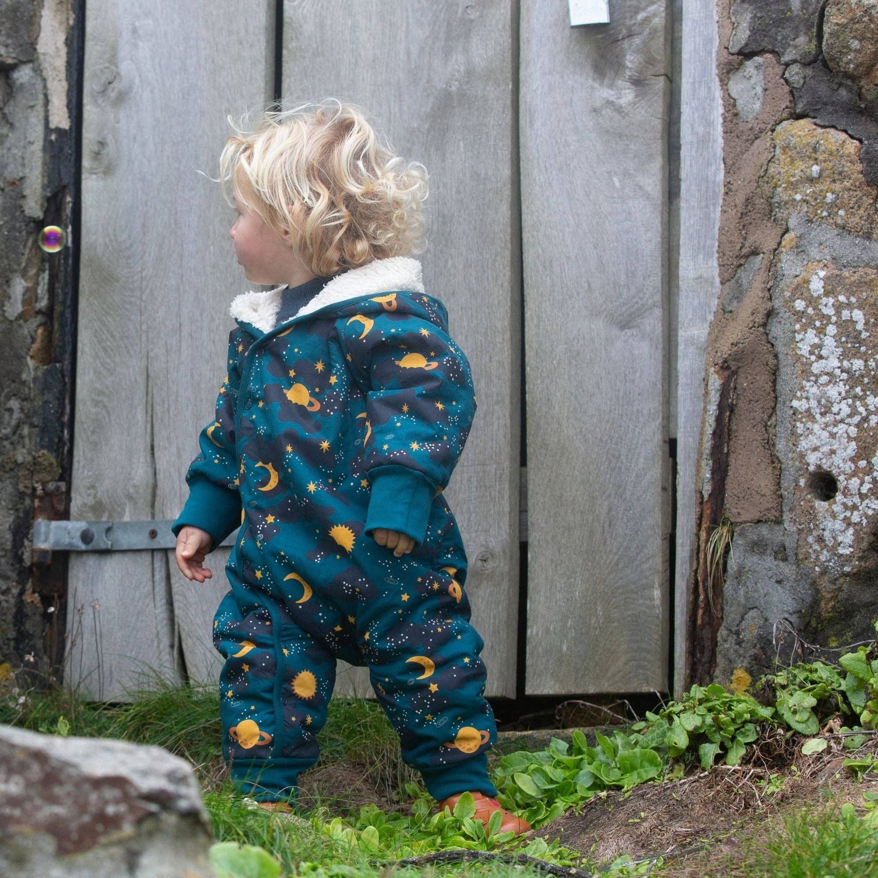 100% Organic Fairtrade Poplin & Sherpa Cotton Our snuggly Snowsuits are made using a beautifully soft, breathable organic cotton sherpa lining on one side with a patterned, durable poplin layer on the outside. This is a warm and cosy style that can be worn over clothes as a Pram Suit or as an all-in-one for toddlers on the move so they can stay snug whatever their adventure. Pair with our matching winter sherpa styles for a lovely set. Extra Details: - Beautifully soft, breathable 100% organic cotton sherpa lining (no polyester in sight!) to keep them warm without overheating - Woven, hard wearing and durable outer layer to keep them cosy on cold or drizzly days - Unisex design for boys and girls - Fold-over cuffs on the arms and legs to keep hands and feet warm, and to give room for growth - Machine washable Our Sherpa fabric is made from 100% organic and unbleached cotton.