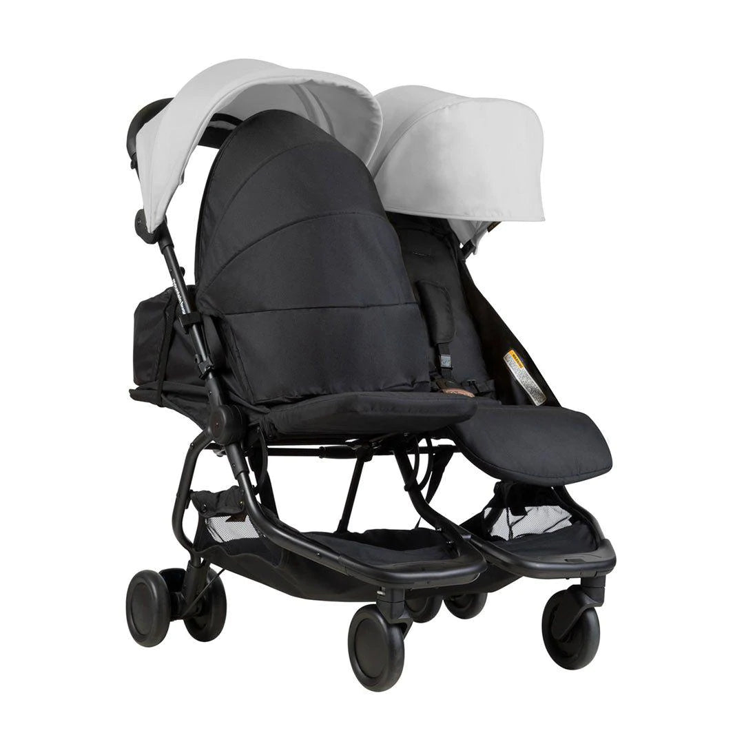 Featuring an ultra compact fold, extra large seats, adjustable leg rests and full coverage sun canopies. The Nano Duo offers a true Mountain Buggy experience for parents on the go.