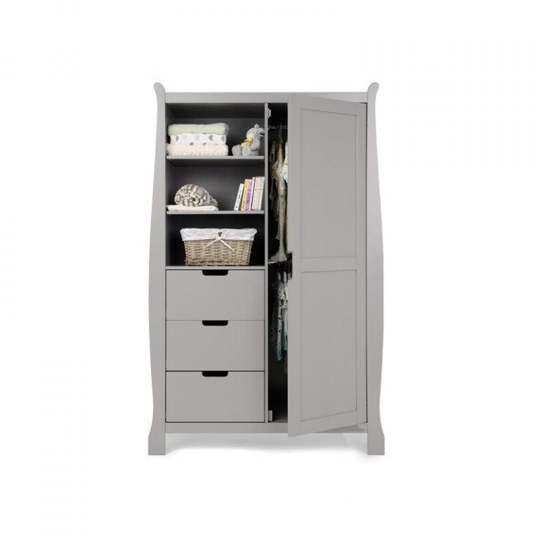 The quality of the design is complimented perfectly by the generous storage options available. A full height, soft close door encloses the main cupboard section with two hanging rails for storing little one’s beautiful clothing. For the smaller belongings, the left-hand side of the wardrobe is divided between three height adjustable shelving spaces and three spacious 21L capacity drawers ensuring that there’s always a perfect place for storing or displaying any precious possessions. This beautiful wardrobe features the same elegant sleigh design that flows through the rest of the Stamford range. Sleek lines and recessed handles create a stylish and uncluttered look whilst ensuring it remains snag free and simple to use.