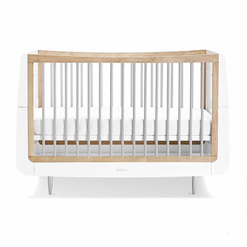 This SnuzKot Skandi Cot Bed in grey features slats with a natural wood inner frame - giving it a tailored look.