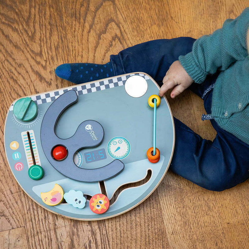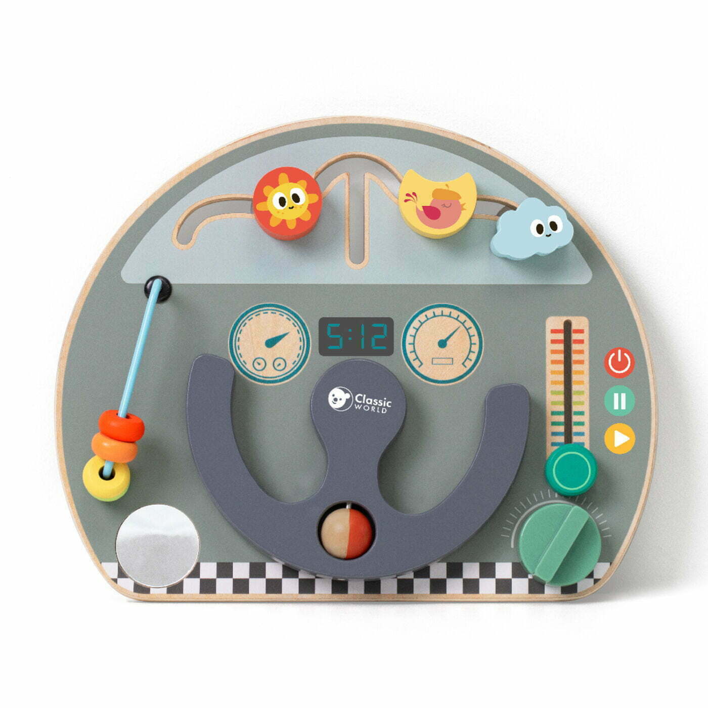 The travelling busy board comes with fun games and activities for little ones whilst also enhancing their driving knowledge and skills. With all the essential elements of a dashboard, children will enjoy pretending to drive in the back seat! Its many functions and activities will provide hours of entertainment. Made from wood and metal so simply wipe to clean.