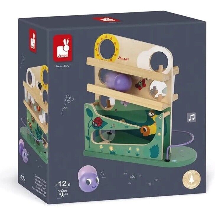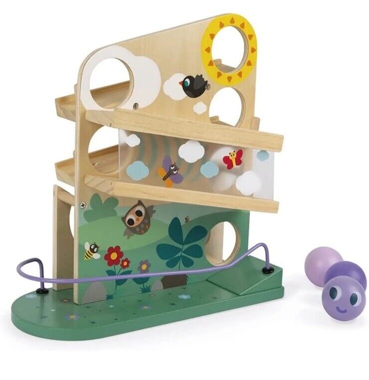 Ball Track with 3 balls which pass through the sun and the clouds then inside a transparent tunnel. As they pass, they ring the bell and then land in the garden forming a caterpillar.