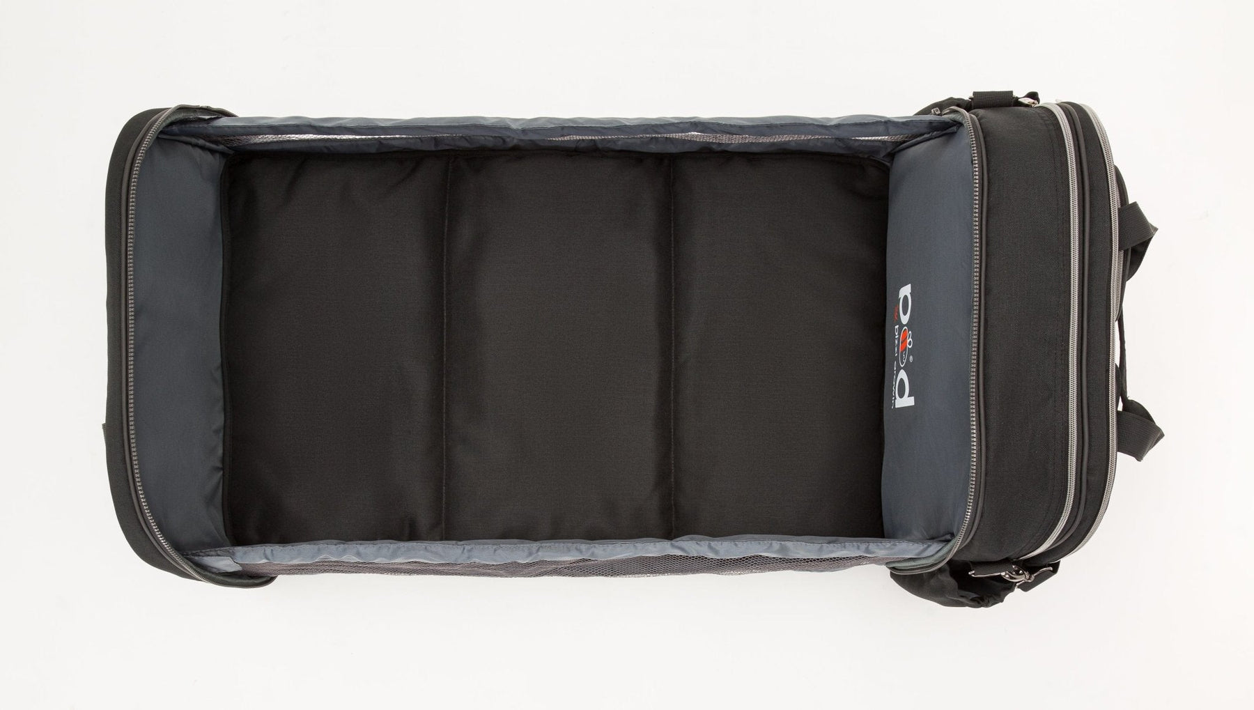 Bizzi Growin Pod bag in black with fold out travel crib and padded mattress for baby naps and changing.
