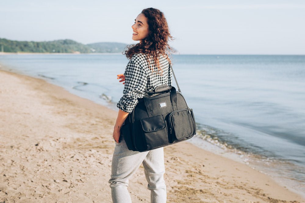 Woman carrying black Bizzi Growin Pod bag bowling style by the beach with ocean background