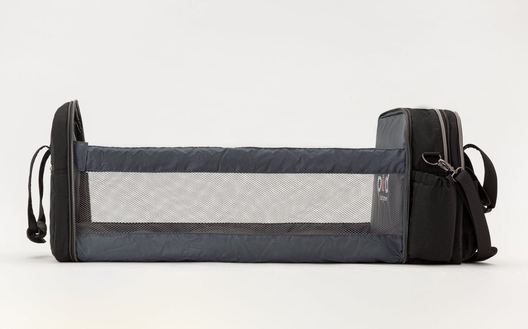 Bizzi Growin Pod bag in black with fold-out travel crib and mesh sides for baby&
