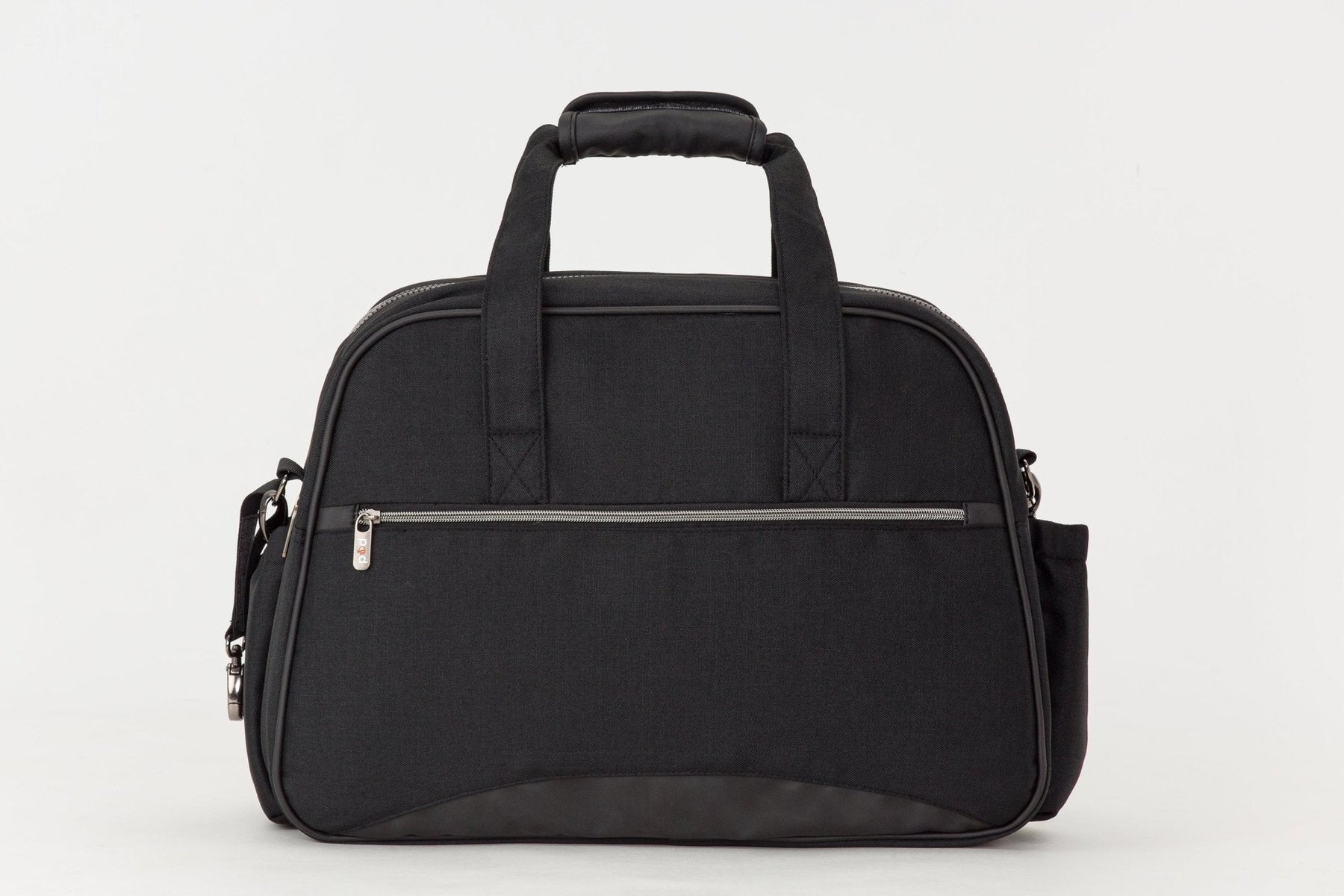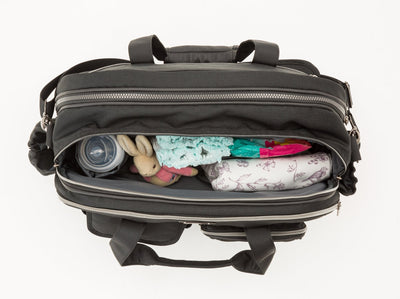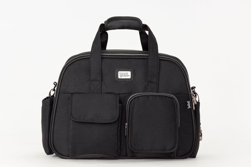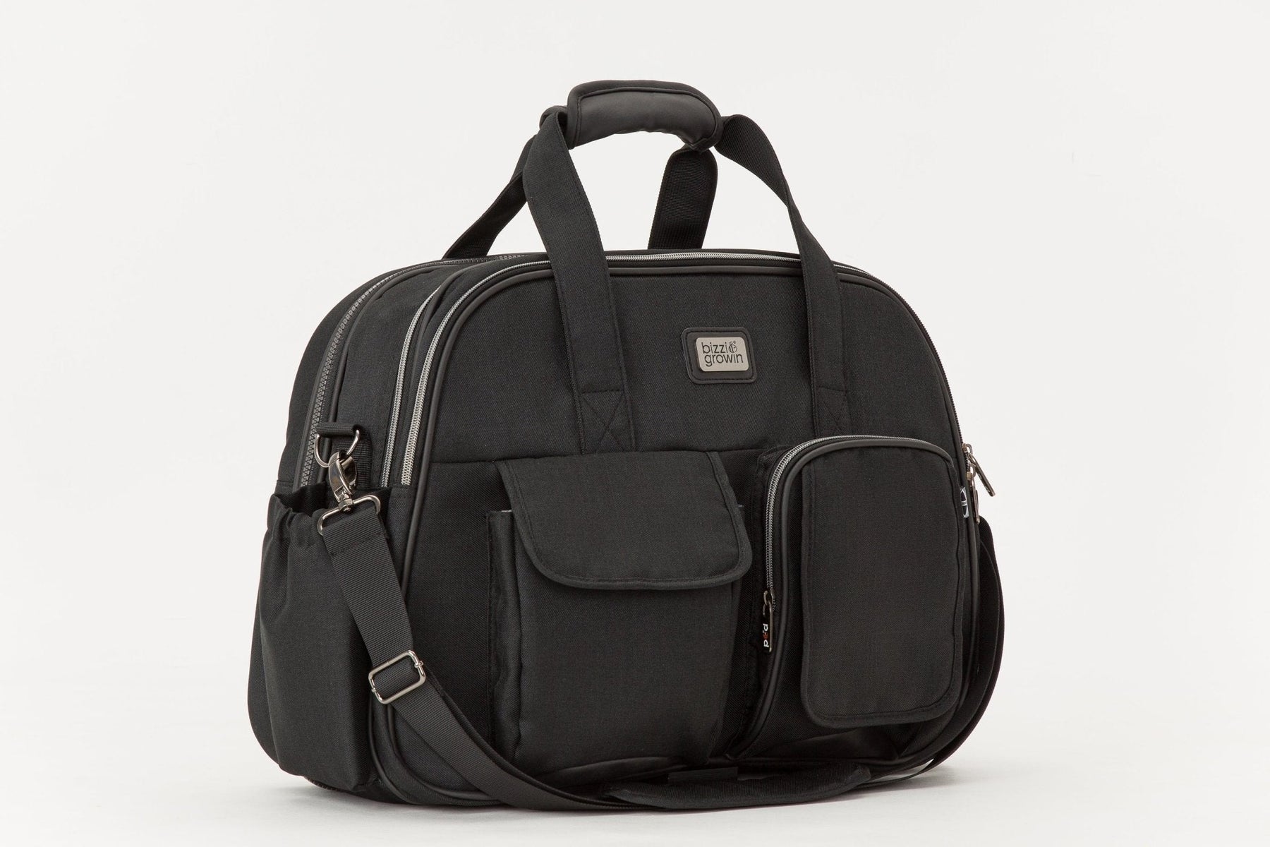 Black Bizzi Growin Pod bag with multiple pockets and carry handles for baby travel and changing needs