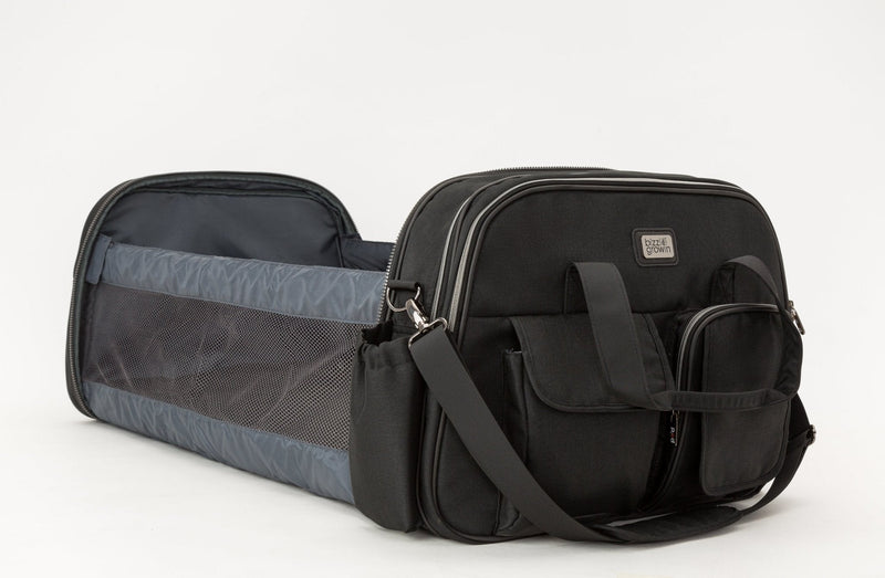 Bizzi Growin Pod bag in black with fold-out crib, multiple compartments, insulated bottle pocket, carry handles, and shoulder strap for baby travel and changing.