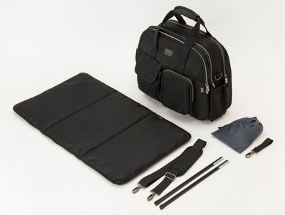 Bizzi Growin Pod bag in Chelsea black with fold-out crib, insulated bottle pocket, and multiple compartments for baby essentials.