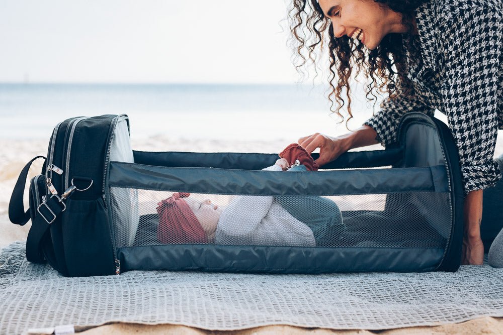 • Unique, convertible changing bag with fold out, easy to assemble crib