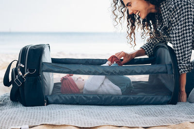 Bizzi Growin Pod bag in black used as fold-out travel crib with baby lying inside and woman sitting nearby