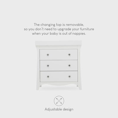 The Clara 3 drawer dresser & changer is designed to offer you style, storage and function, with 3 spacious drawers, a removeable changing station and classic styling to transform a modern nursery.