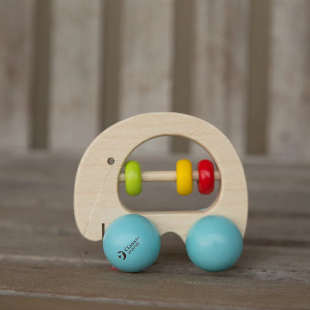 This elephant rattle and push toy is great for infants. It’s fun, colourful and interactive. And of course, it’s safe: made from beach wood with non-toxic water based stain.