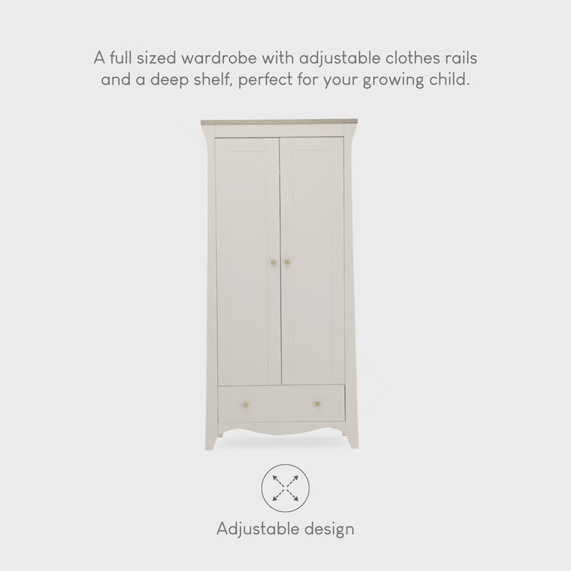 - The Clara Nursery Wardrobe has ample room to keep your baby’s clothes organised. This double wardrobe has 2 removable hanging rails for keeping their tiny outfits neat and tidy. Inside the wardrobe is a deep shelf, perfect for storing baby bedding or blankets. Plus, the Clara Wardrobe also has a roomy drawer providing extra storage.