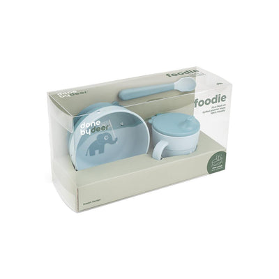 The Done by Deer Foodie First Meal Set in Blue Elphee includes a spoon, cup and bowl. The bowl has a practical suction base that keeps it in place and the spoon has an easy-grip function making it comfortable to feed your baby.