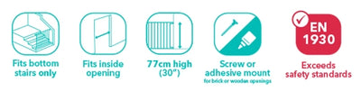 - Meets safety standards; complies or exceeds requirements of EN1930, the safety standard for safety barriers including stair gates as well all the relevant clauses of the toy standard EN71Series.