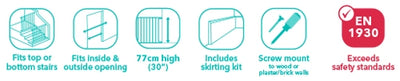Combining modern contemporary interior with uncompromising levels of safety. Fred Screw Fit Stairgate is the perfect solution for child proofing, which blends effortlessly into your home. With the FastMount installation system, fitting a gate has never been so quick and easy; just 4 screws and an included skirting kit! The 180* mount allows a perfect fit, even when walls are at an angle.