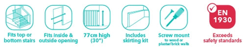 - Meets safety standards; complies or exceeds requirements of EN1930, the safety standard for safety barriers including stair gates as well all the relevant clauses of the toy standard EN71Series.