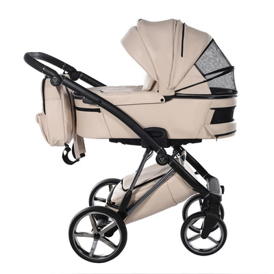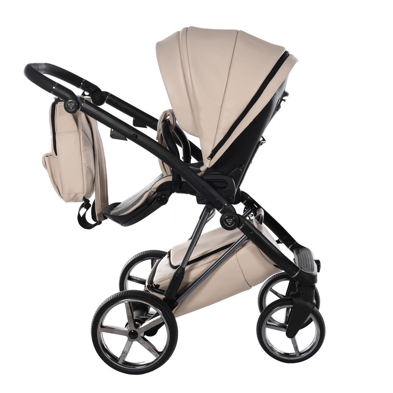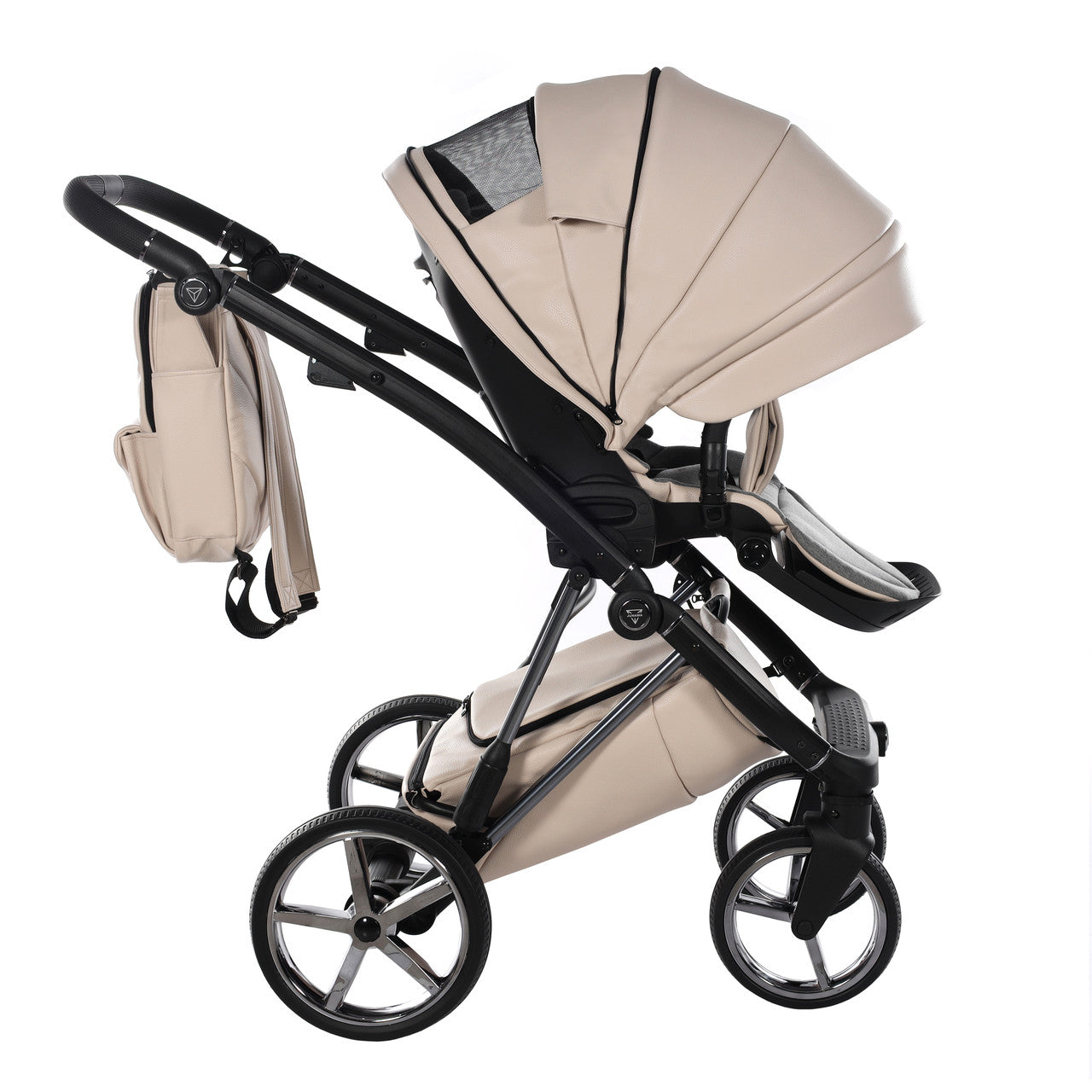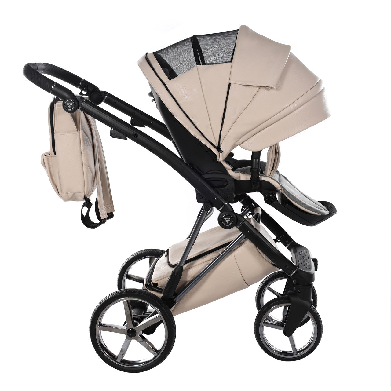 The Junama Air Premium pram is a sleek eco leather pram. The pram has different ventilation panels that will keep your baby comfortable in the hotter months. The Air Premium Nude is a high quality nude eco-leather pram with a black and black chrome frame, black chrome alloys and black chrome detailing.
