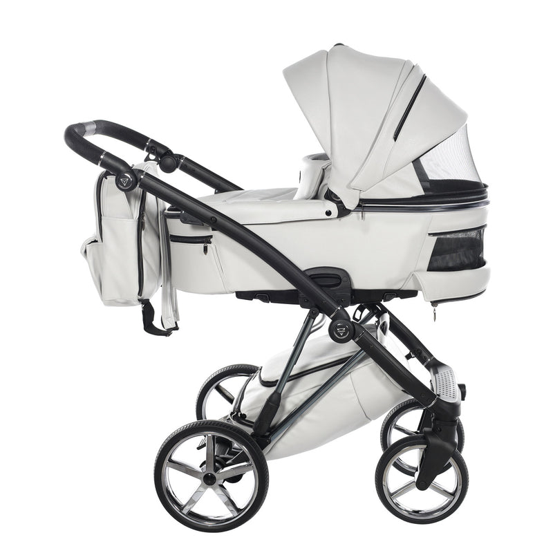The Junama Air Premium pram is a sleek eco-leather pram. The pram has different ventilation panels that will keep your baby comfortable in the hotter months. The Air Premium Pebble is a high quality light grey eco-leather pram with a black and black chrome frame, black chrome alloys and black chrome detailing.