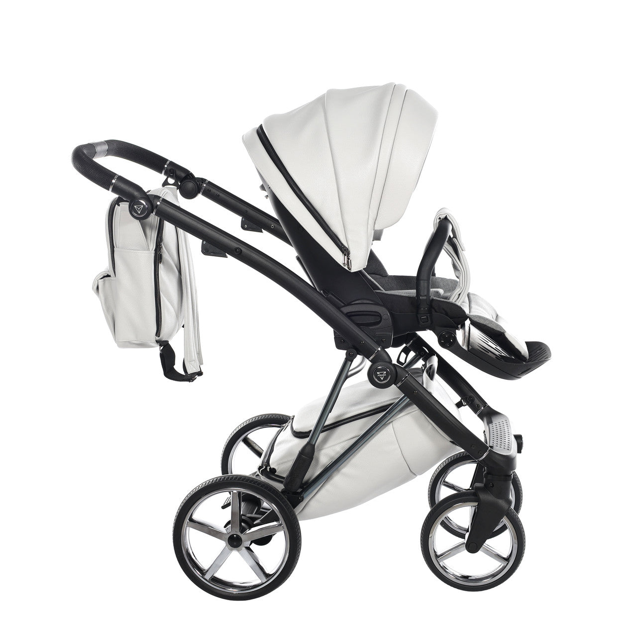 The height adjustable handle bar can be adjusted 180° to suit all members of the family and has an eco-leather finish for utmost comfort. The ingenious folding mechanism allows for a compact collapse, the chassis can fold together with the pushchair seat unit attached, protecting the upholstery and ensuring hygiene.