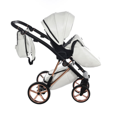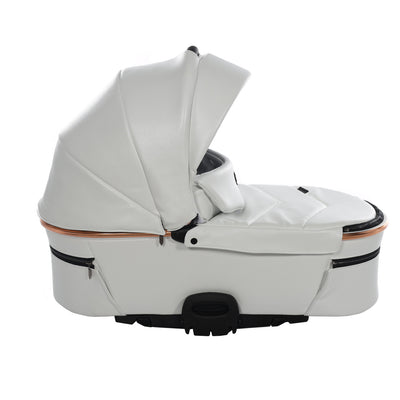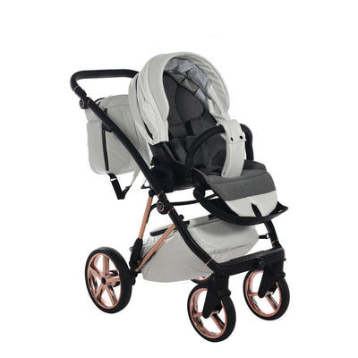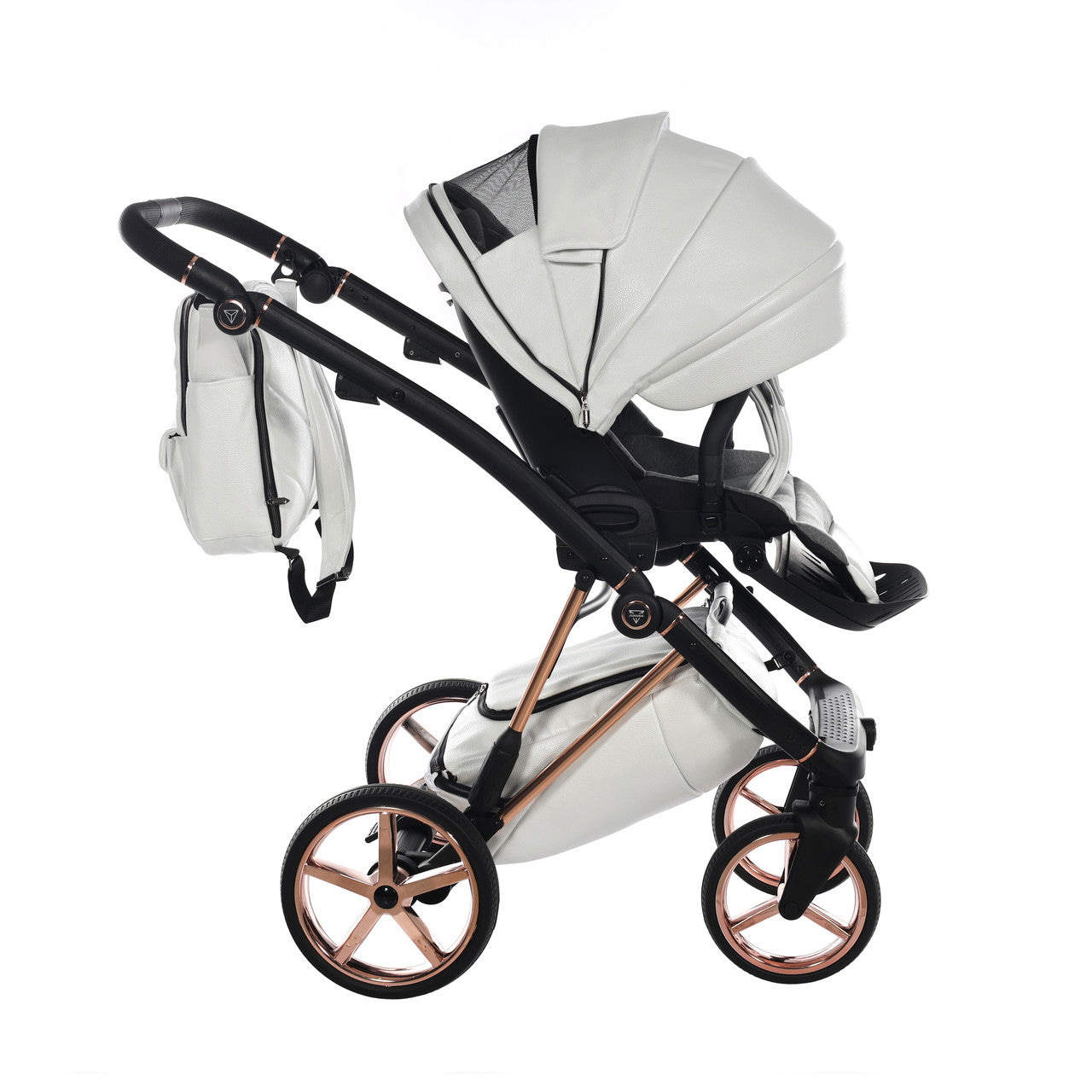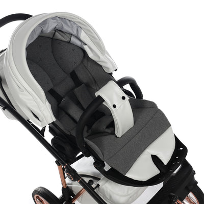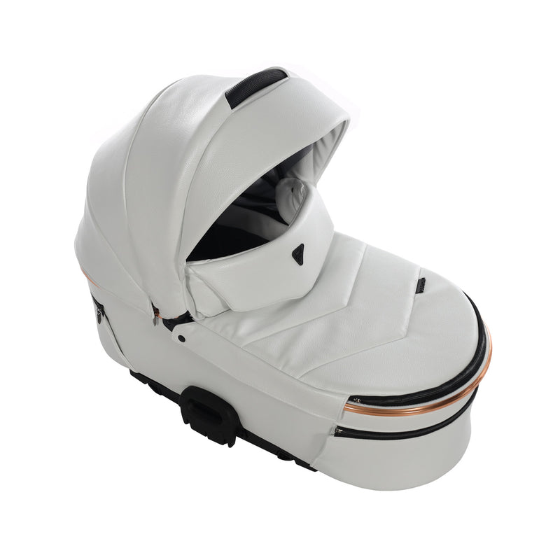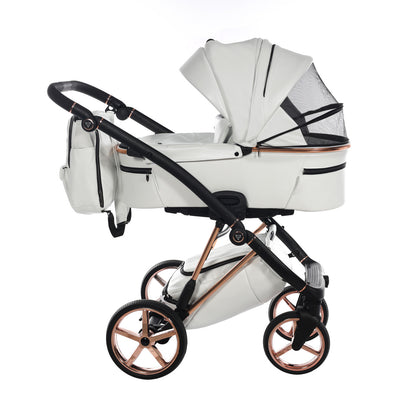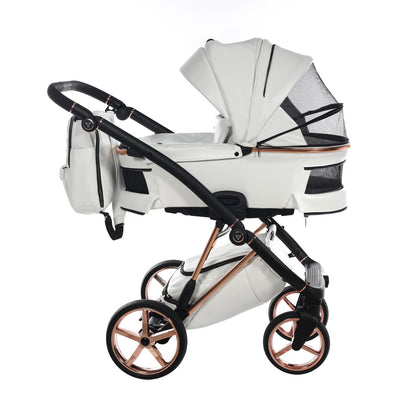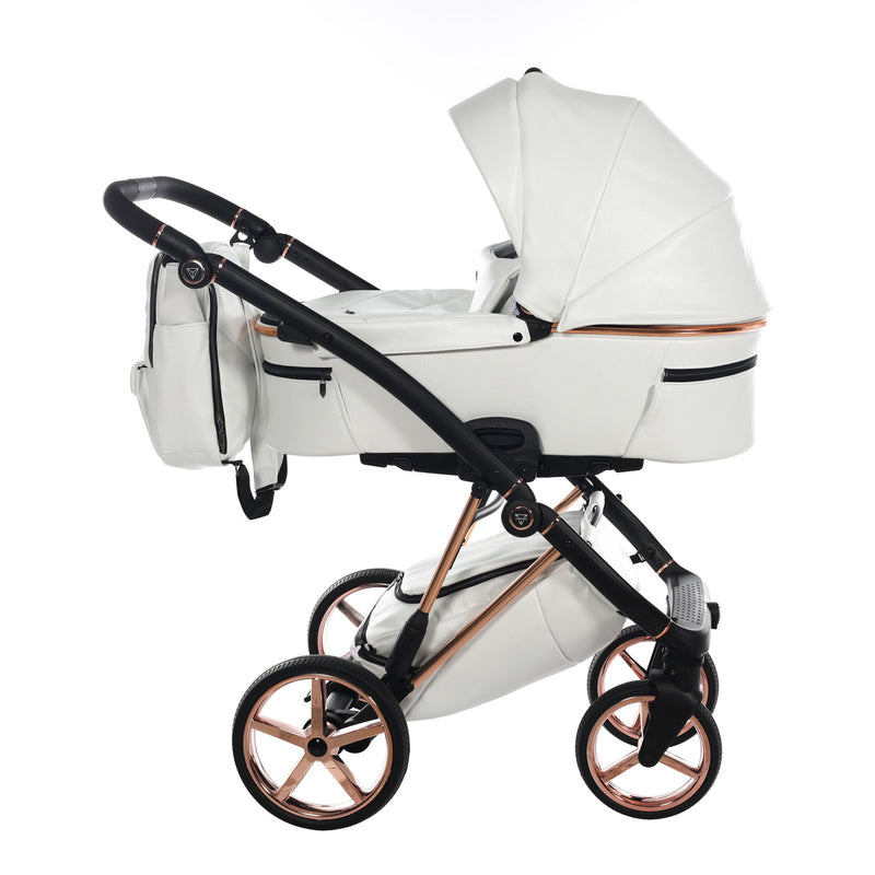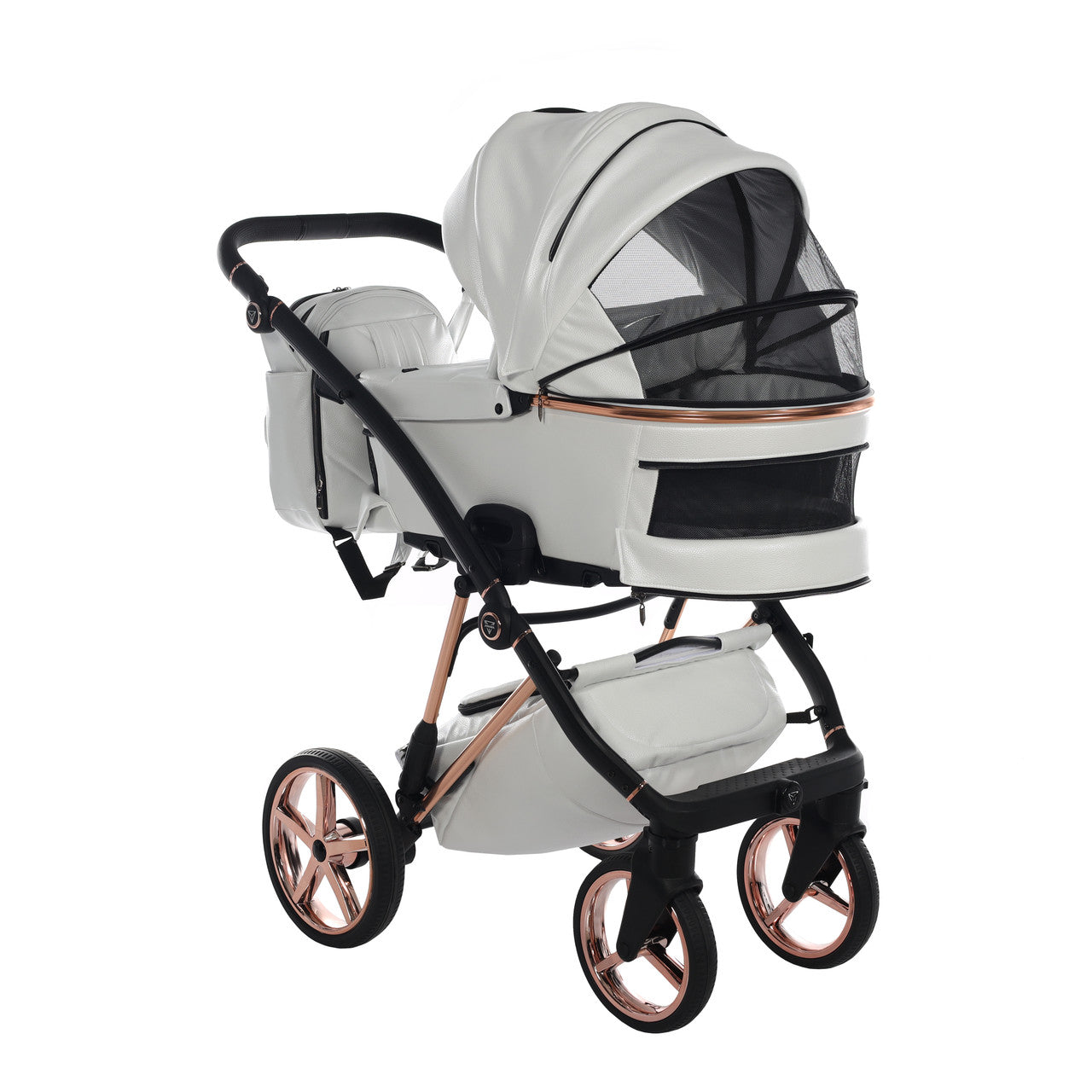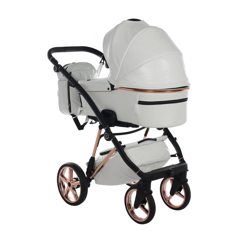 The Junama Air Premium pram is sleek eco leather pram. The pram has different ventilation panels that will keep your baby comfortable in the hotter months. The Air Premium White is a high quality white eco-leather pram with a black and rose gold frame, rose gold alloys and rose gold detailing.